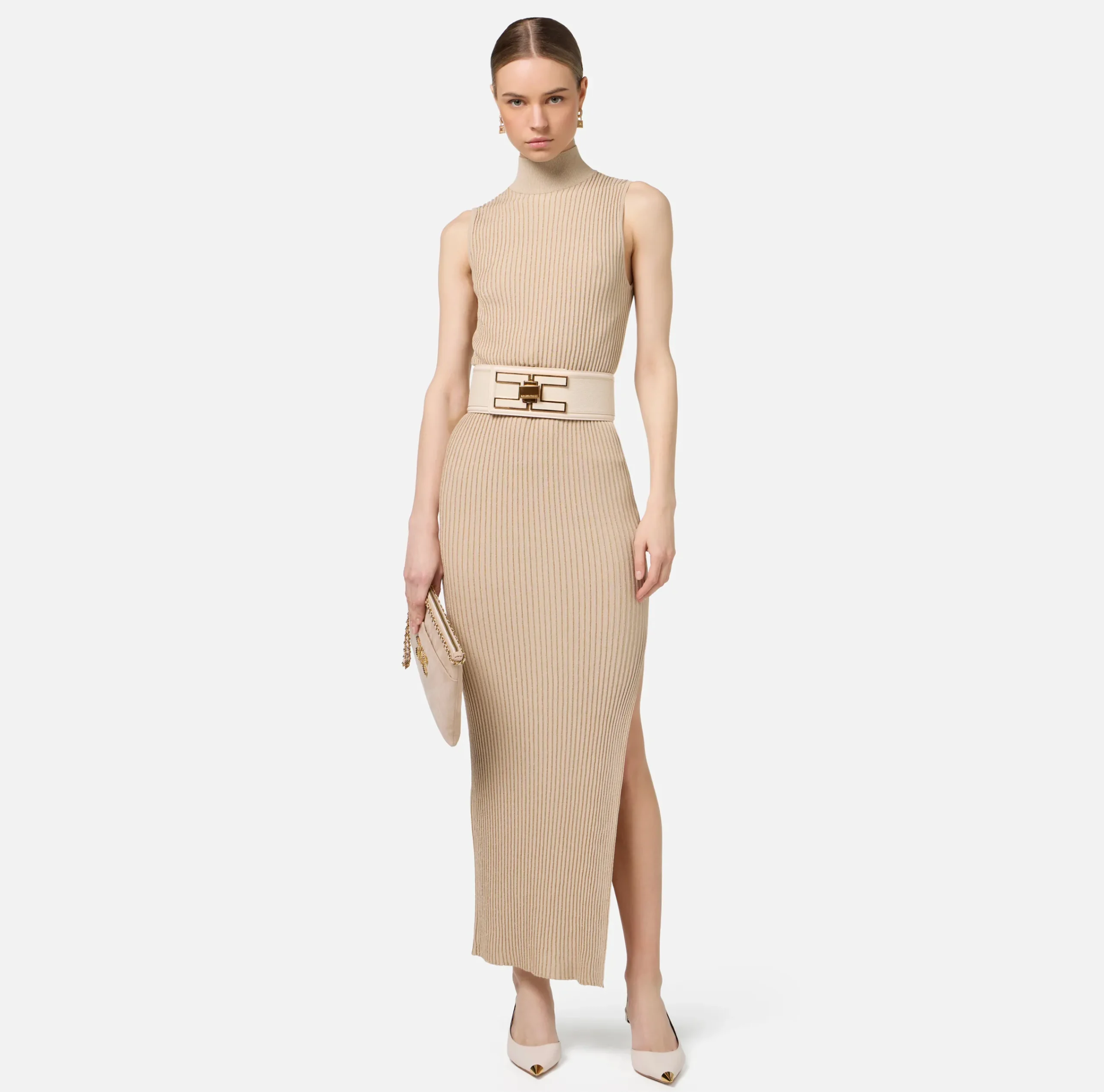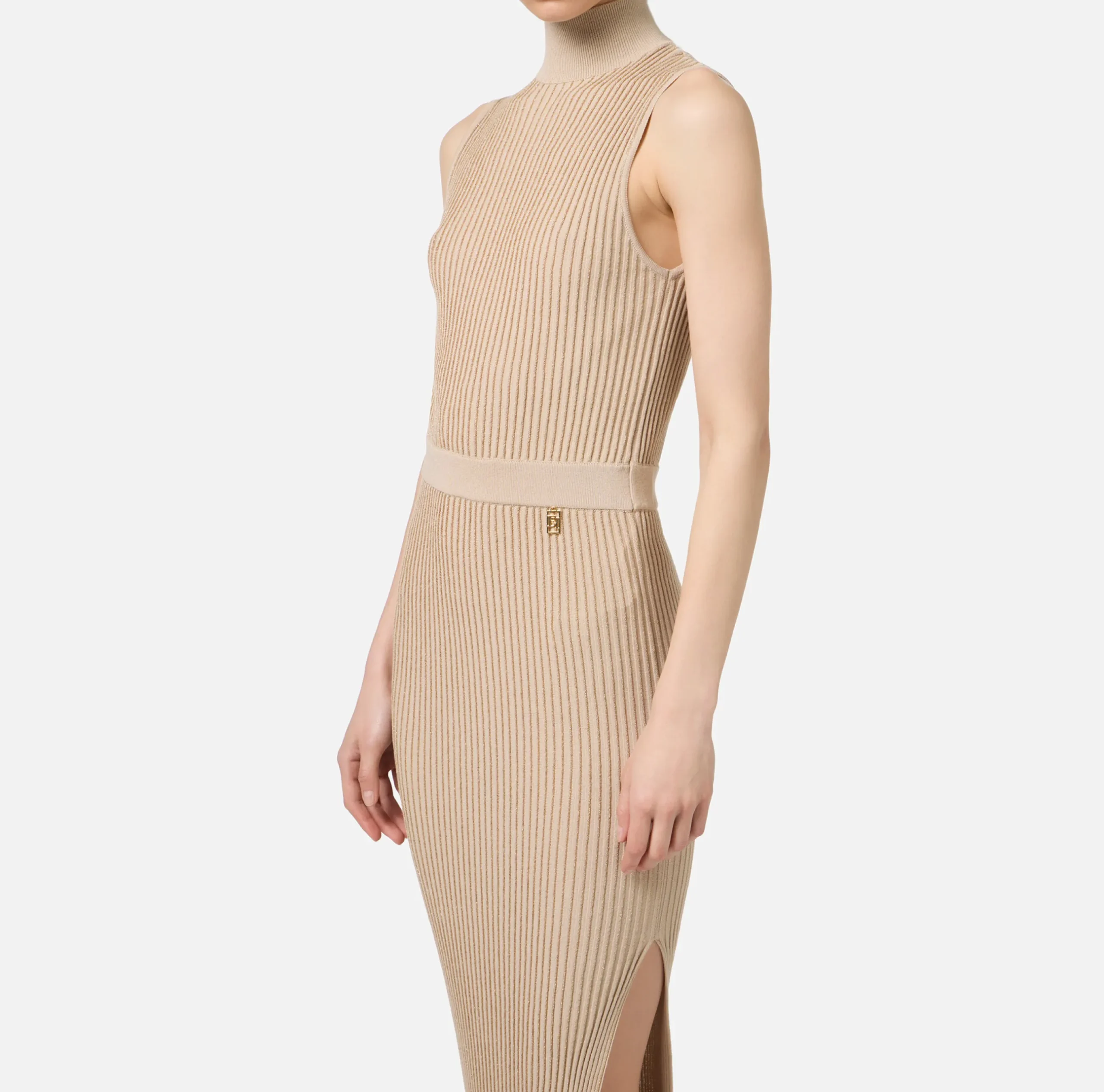 Abito midi smanicato in viscosa lurex a costine con collo alto. Il punto vita è enfatizzato da fascione con charms logo in metallo dorato che sovrasta la gonna con spacco laterale.
