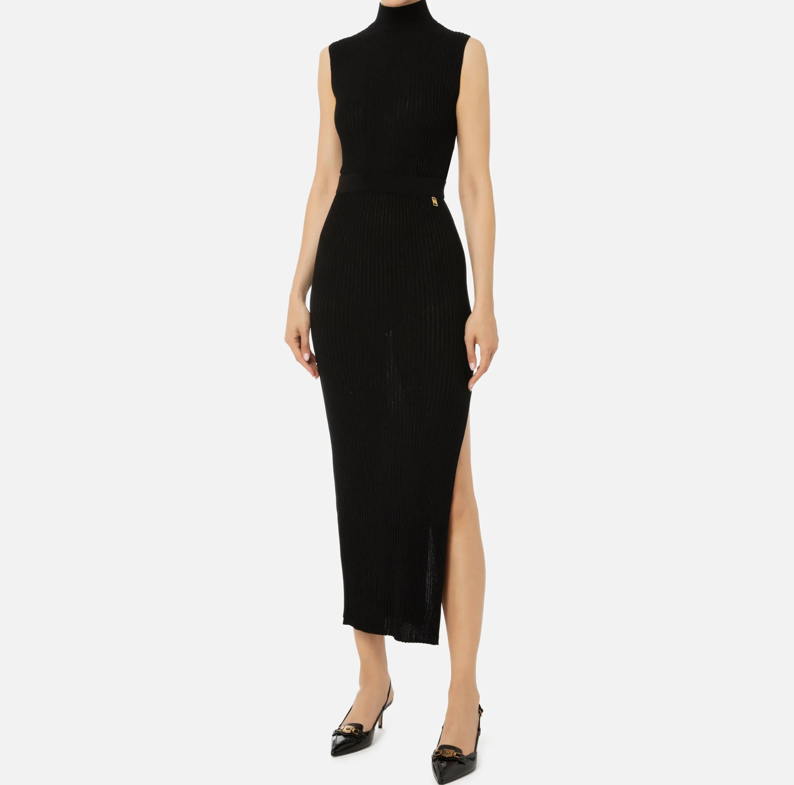 Abito midi smanicato in viscosa lurex a costine con collo alto. Il punto vita è enfatizzato da fascione con charms logo in metallo dorato che sovrasta la gonna con spacco laterale.