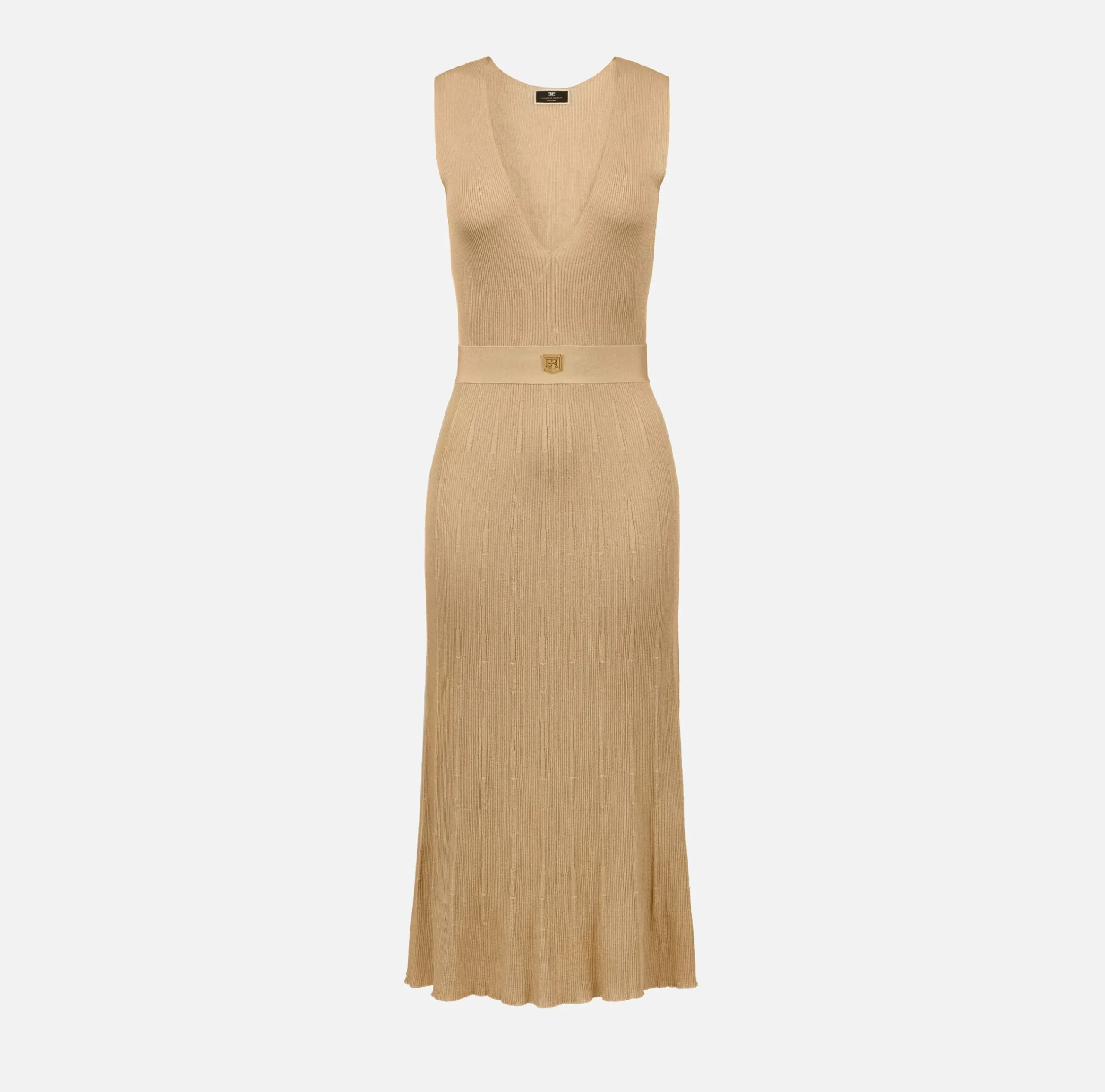 Abito midi smanicato in viscosa a costina plissé con scollo a V. Il punto vita è enfatizzato da un fascione con placca logo in metallo dorato che sovrasta la gonna svasata al fondo.