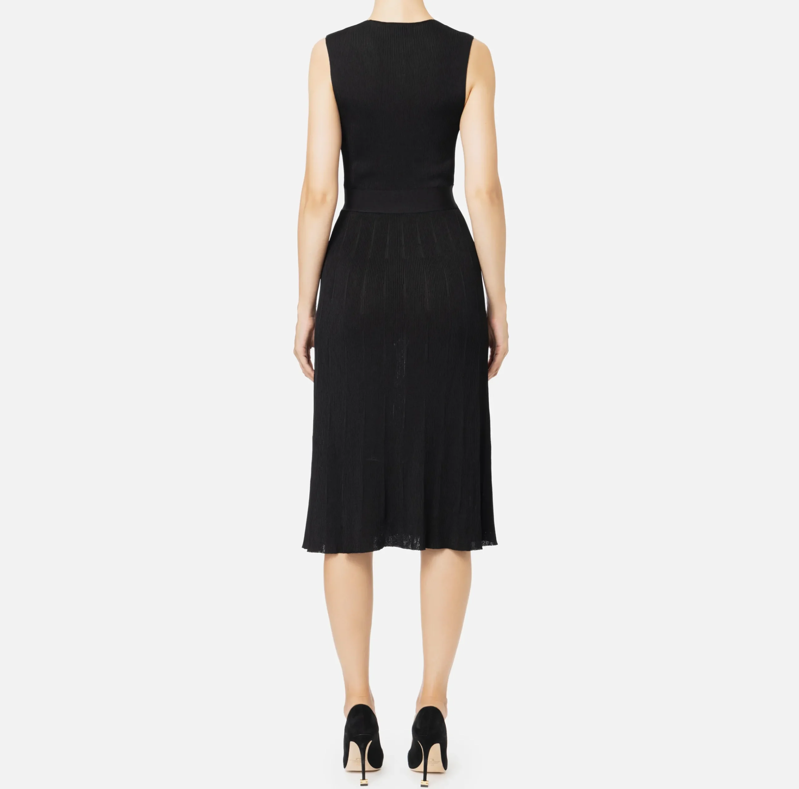 Abito midi smanicato in viscosa a costina plissé con scollo a V. Il punto vita è enfatizzato da un fascione con placca logo in metallo dorato che sovrasta la gonna svasata al fondo.