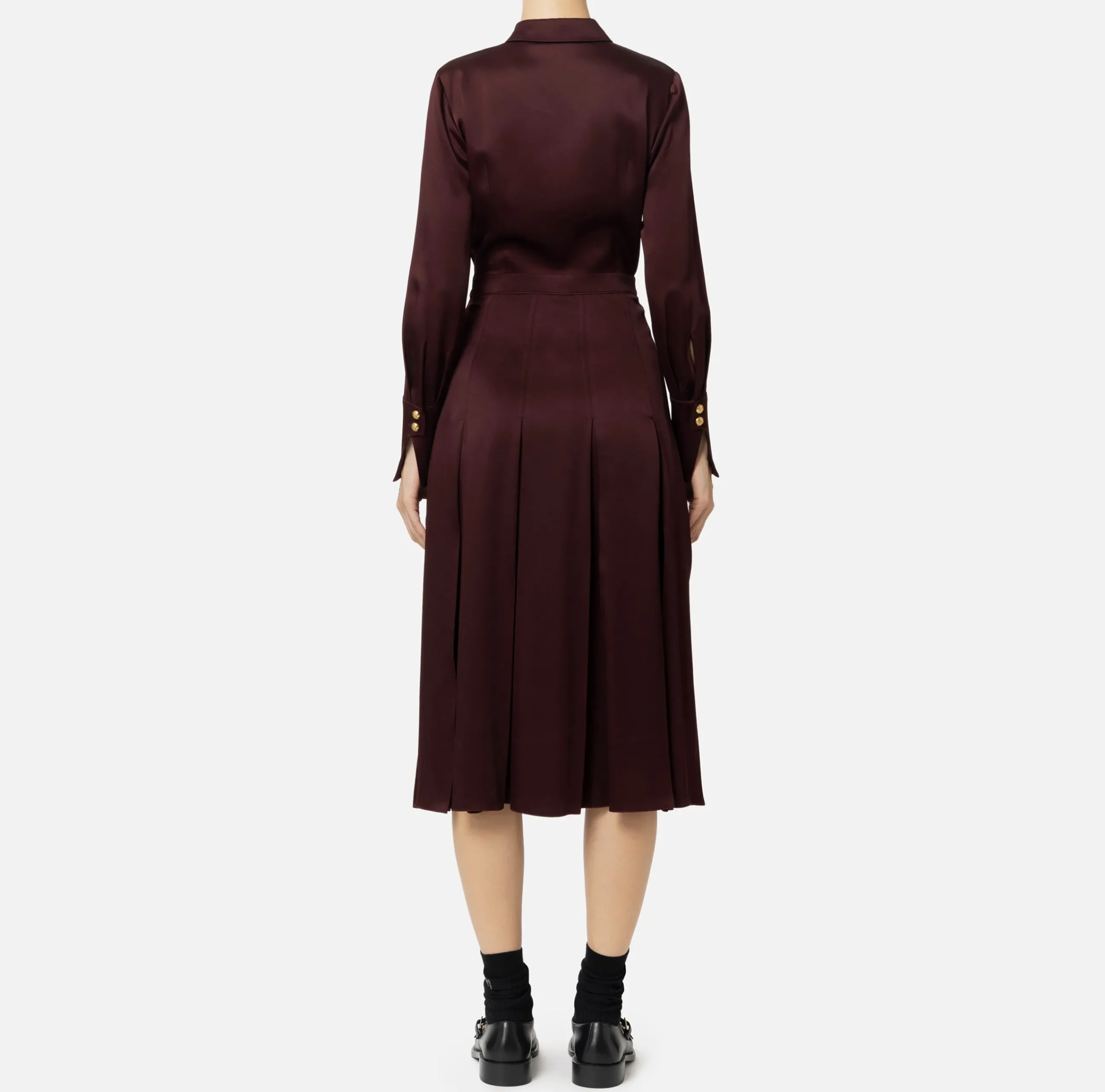 Abito chemisier in crêpe con maniche a 3/4 e gonna midi a pieghe larghe. È caratterizzato da motivo di tasche con patte ricamate in tono e doppio cannoncino decorato con bottoni in metallo dorato.