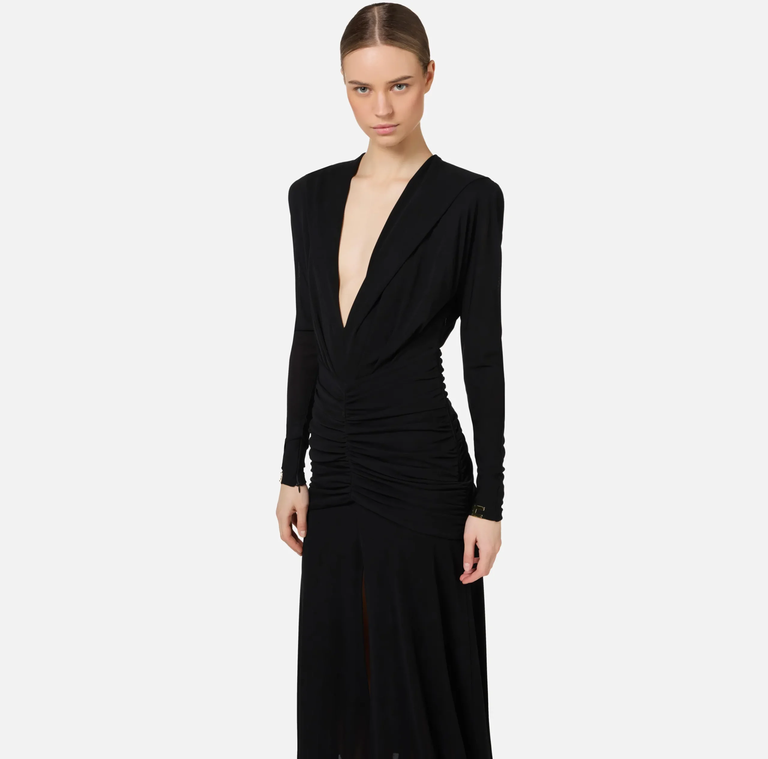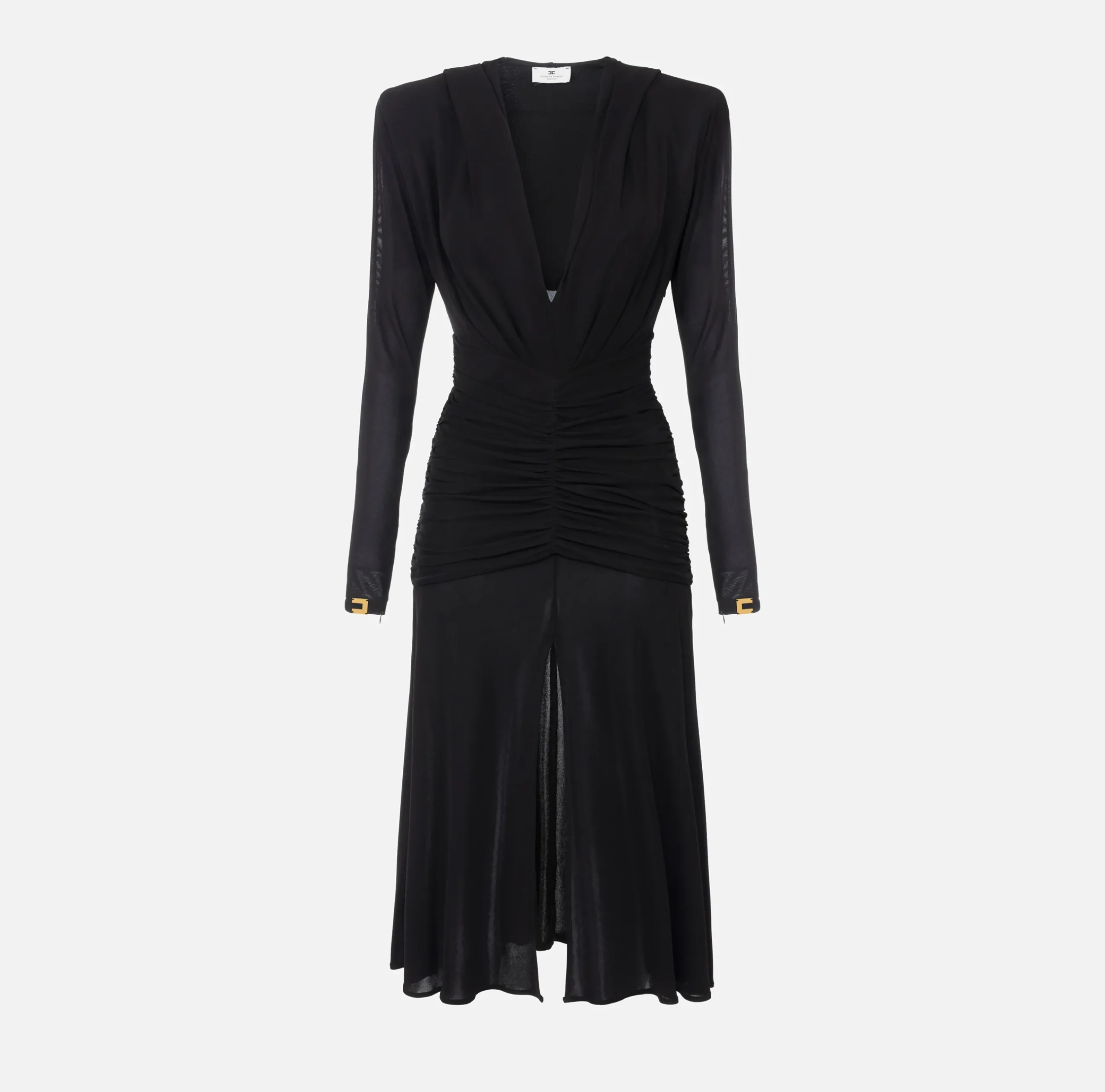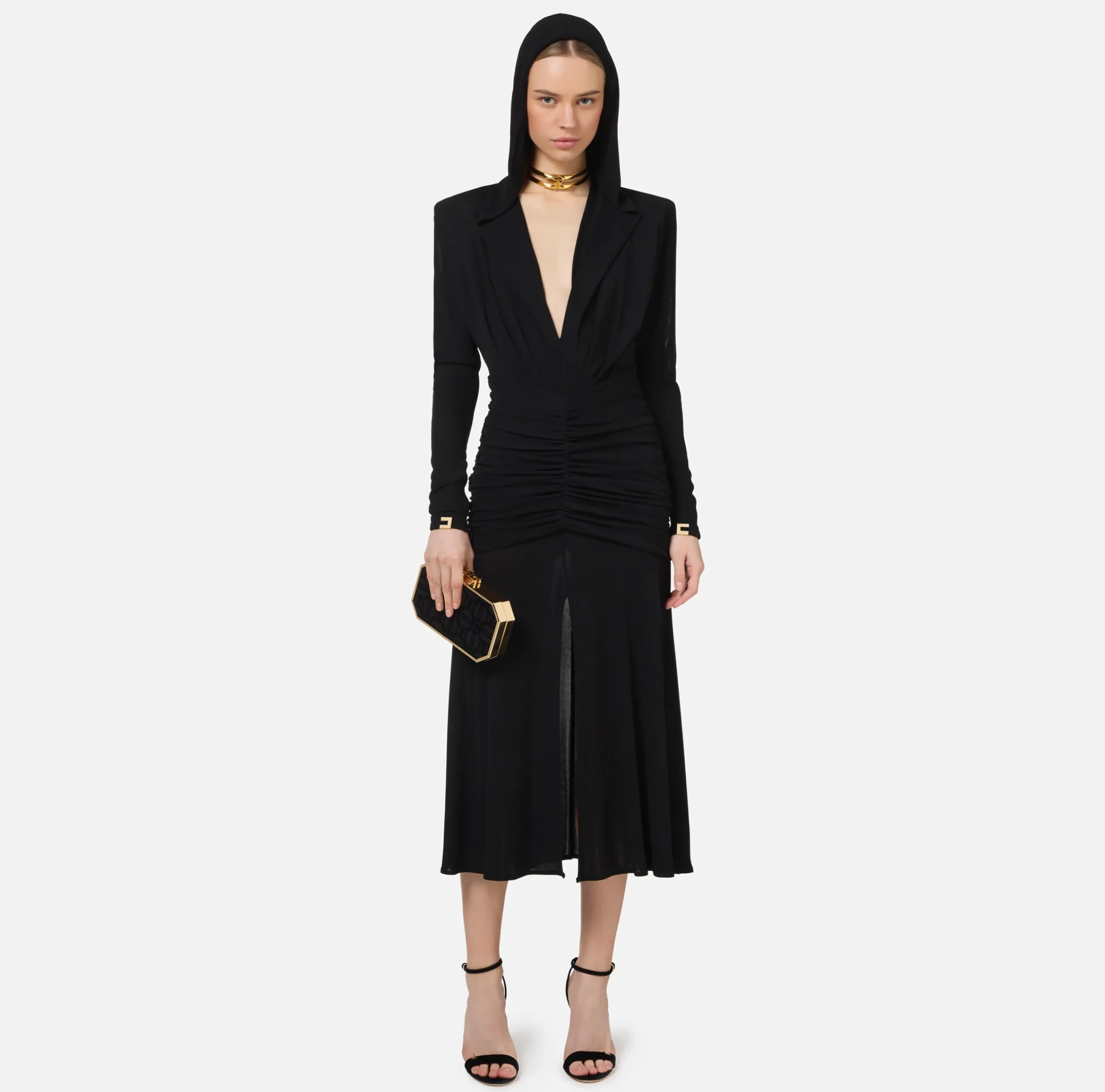 Abito midi in jersey crêpe con cappuccio e maniche lunghe a kimono rifinite da placche logo in metallo dorato. È caratterizzato da profonda scollatura trattenuta da una baschina drappeggiata in vita che sovrasta la gonna con spacco nel centro davanti.