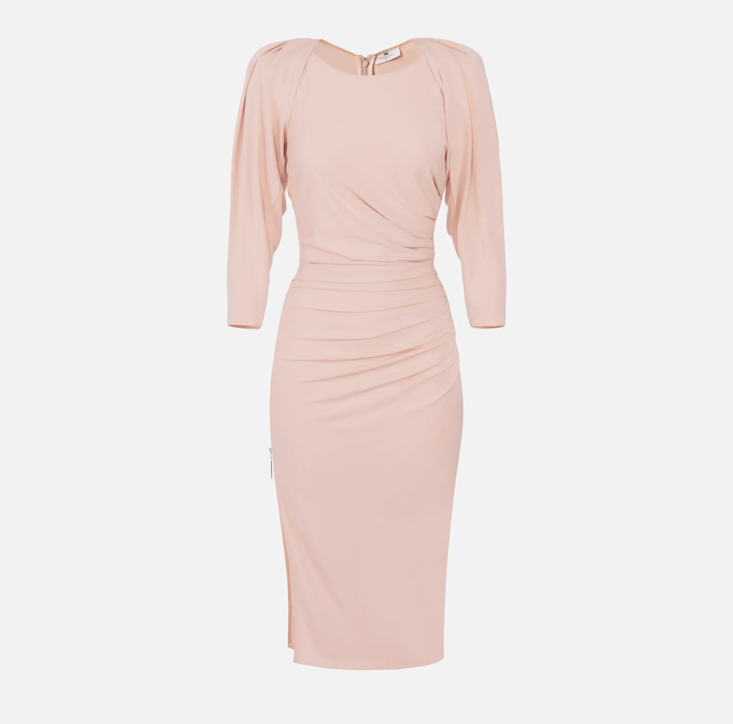 Abito midi in jersey crêpe a maniche a ¾ con scollo a barca e ampie spalle con pieghe. Il punto vita è enfatizzato da un drappeggio sul fianco e spacco laterale rifinito da zip in metallo dorato con tiretto logo.