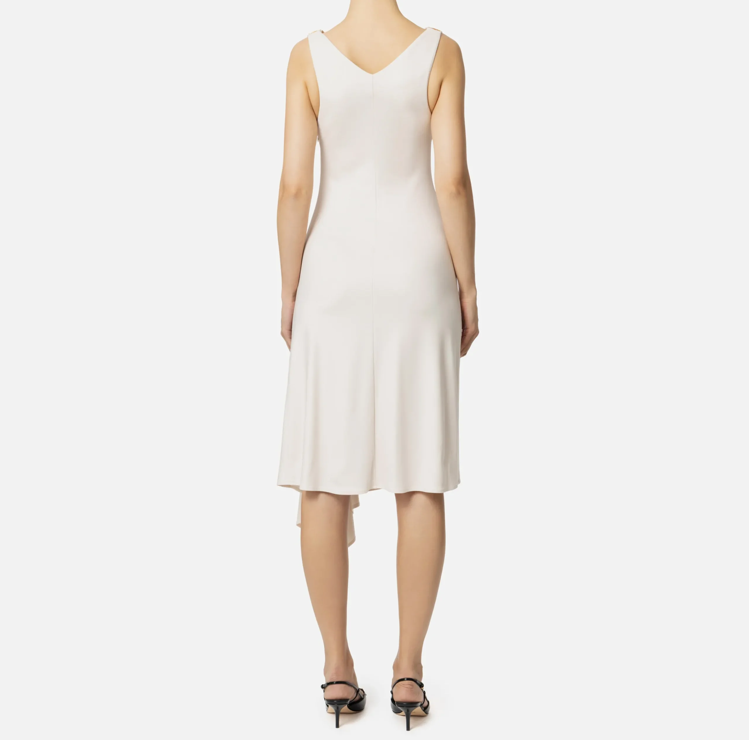 Abito midi in jersey crêpe leggero con gonna asimmetrica che termina lateralmente a punta. È caratterizzato da scollatura a V trattenuta sulle spalle da passanti logo in metallo dorato.