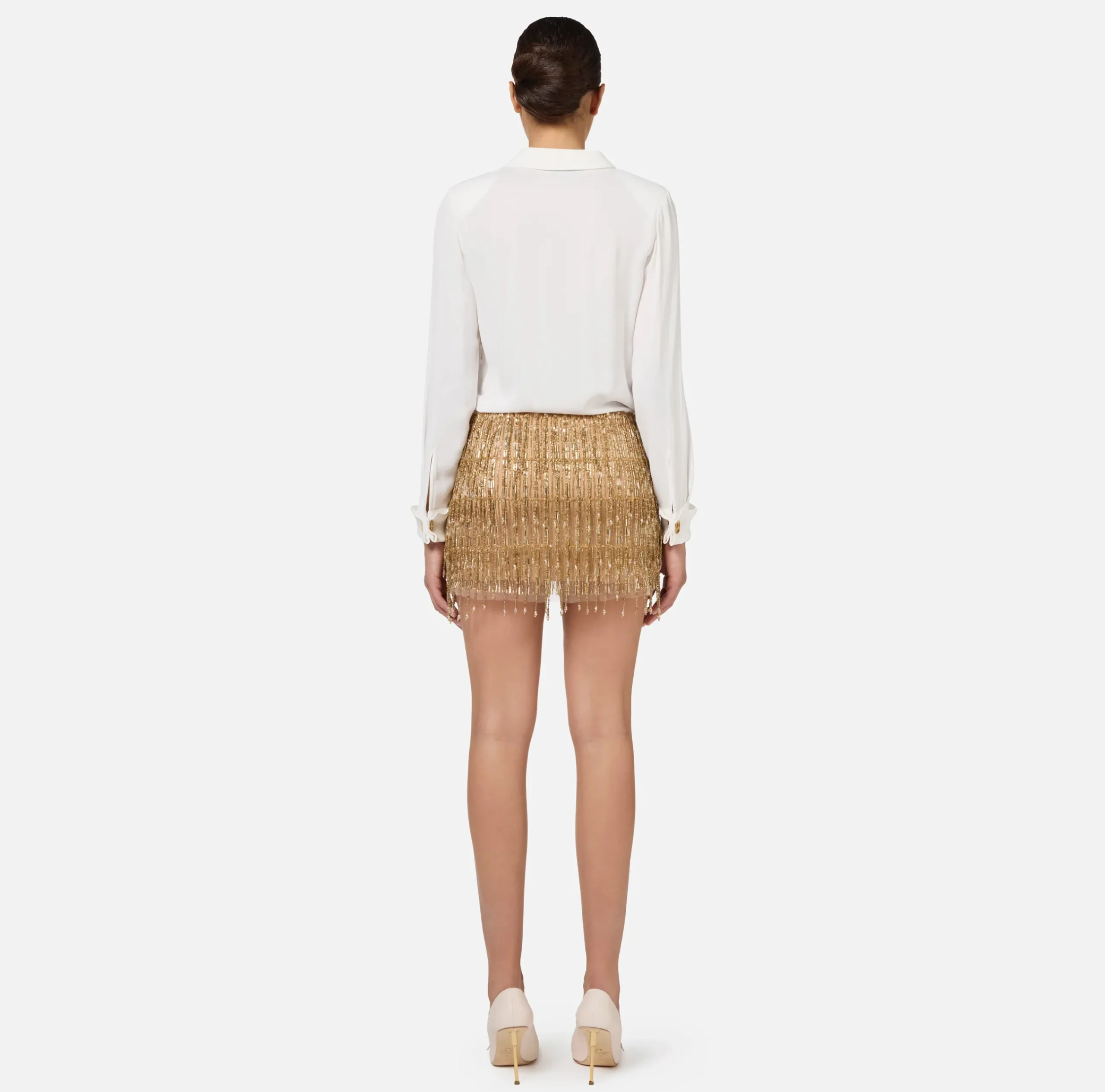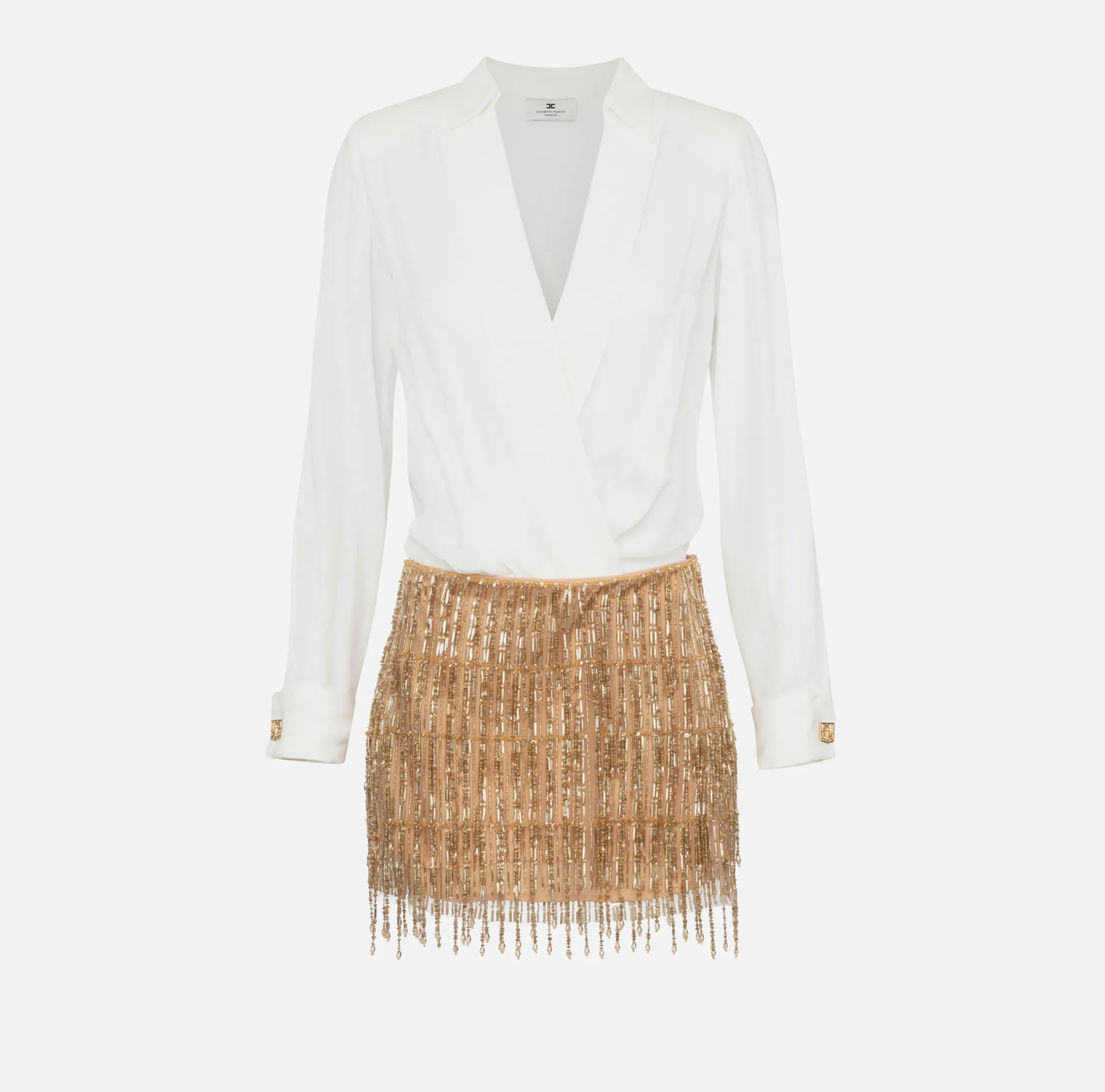 Miniabito in georgette con gonna a vita bassa in tulle interamente ricamato a mano con frange di paillettes e canottiglie a goccia. È caratterizzato da camicia incrociata sul davanti a maniche lunghe con polsi rifiniti da gemelli in metallo dorato.
