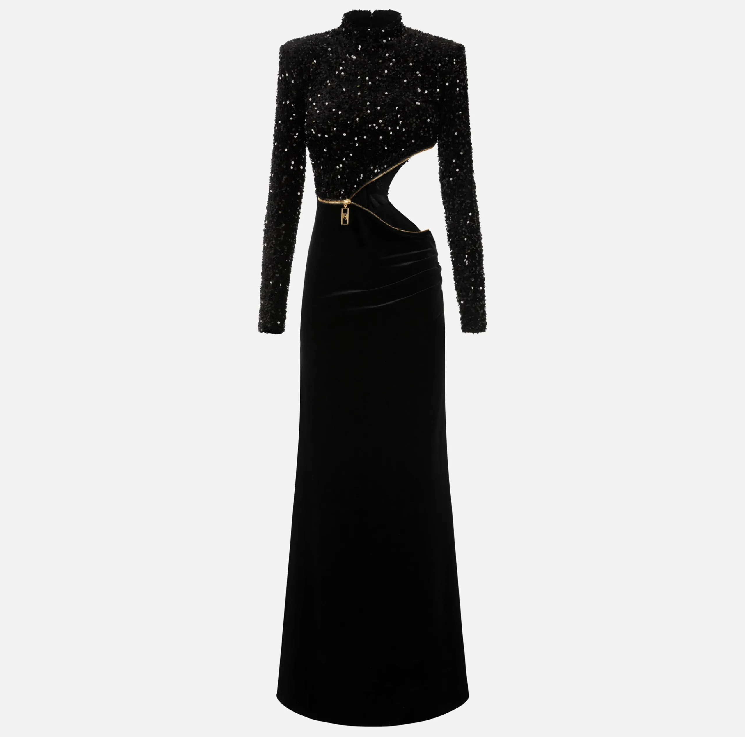 Abito red carpet in ciniglia ricamata con pailettes e gonna a sirena in velluto fluido. È caratterizzato da cut-out in vita rifinito da una zip in metallo dorato con tiretto logato.