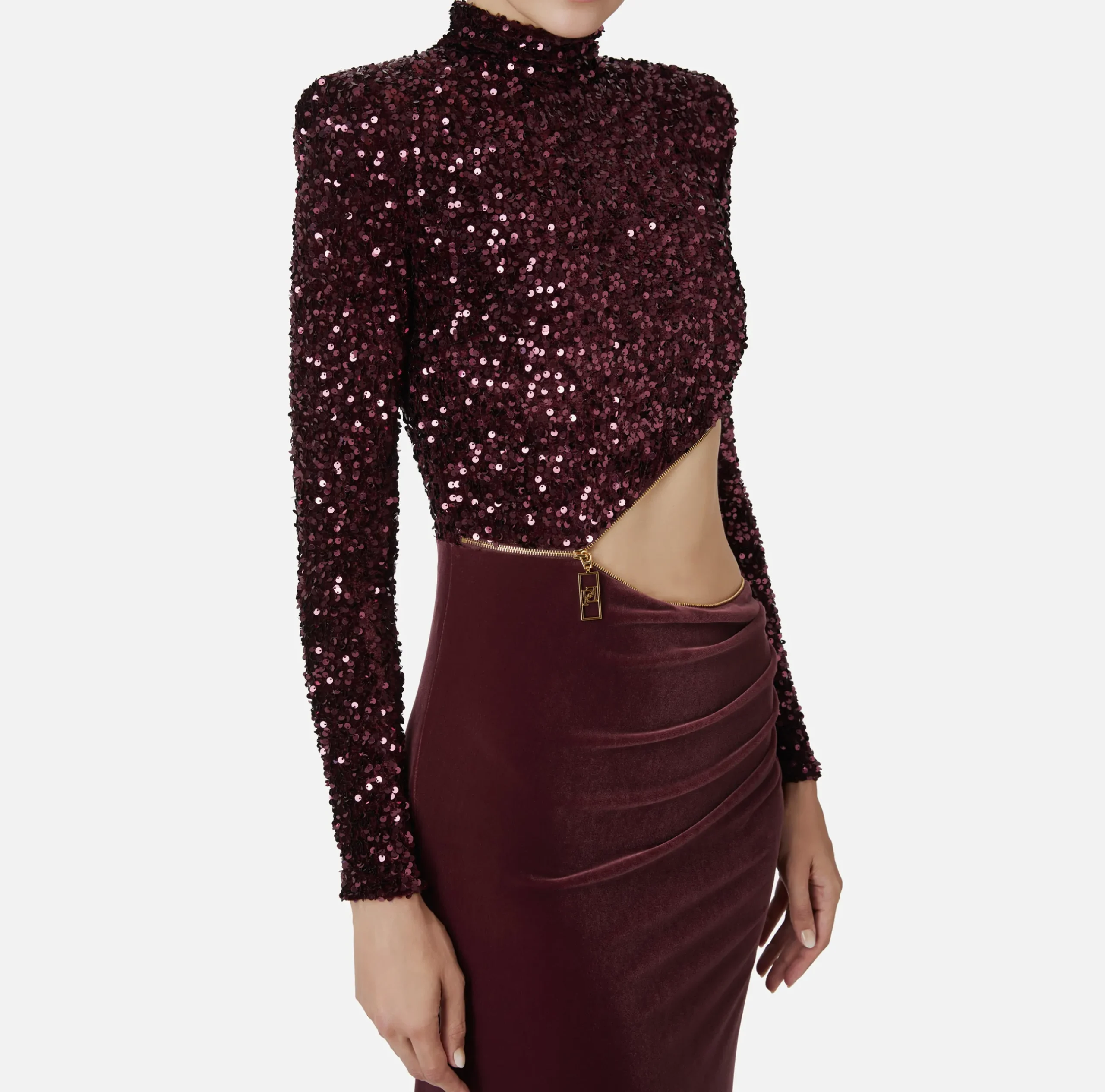 Abito red carpet in ciniglia ricamata con pailettes e gonna a sirena in velluto fluido. È caratterizzato da cut-out in vita rifinito da una zip in metallo dorato con tiretto logato.