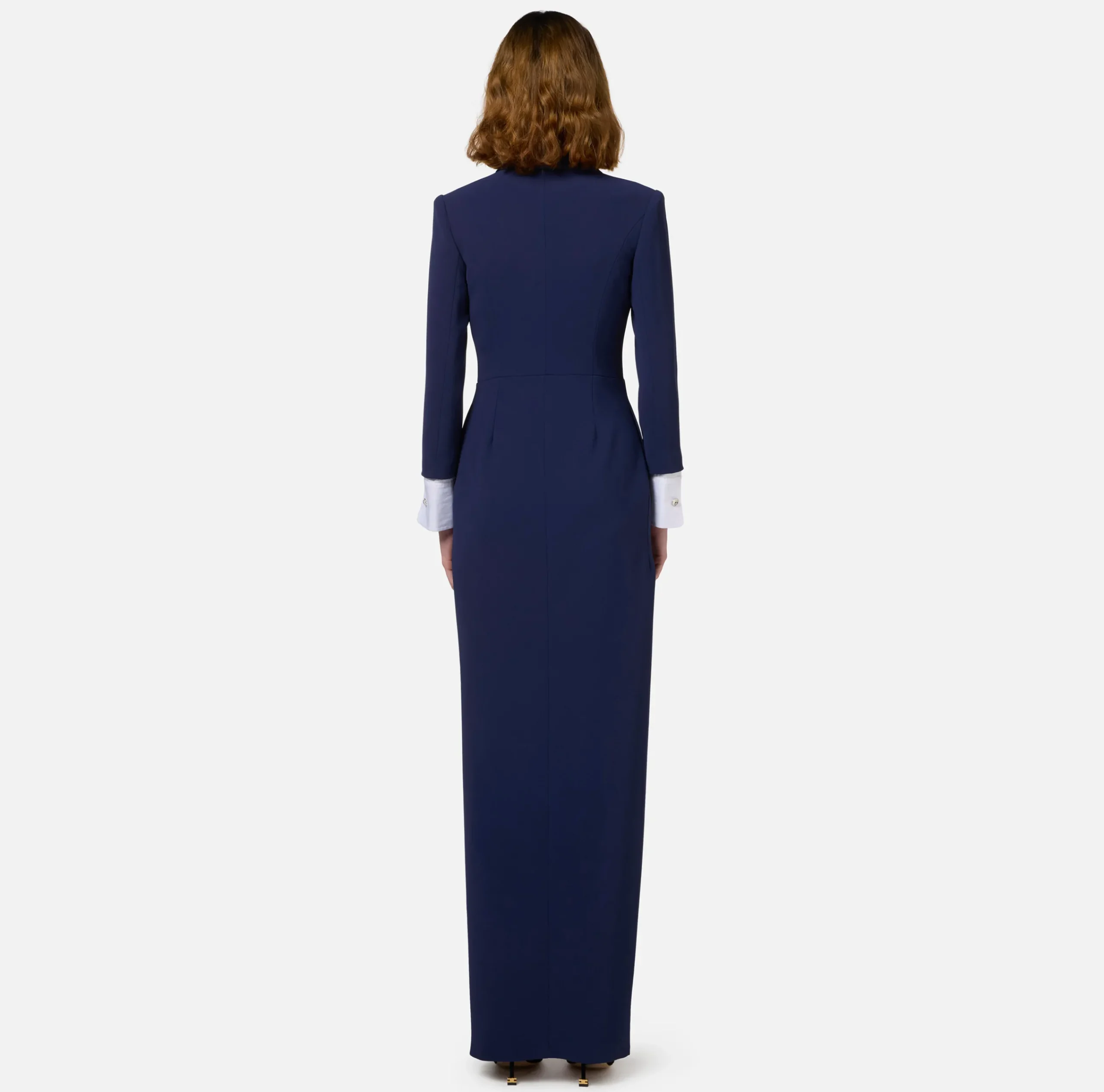 Abito red carpet in crêpe a maniche lunghe con polsi staccabili in popeline di cotone. È caratterizzato da profonda scollatura con revers sciallato in raso e chiusura doppiopetto.