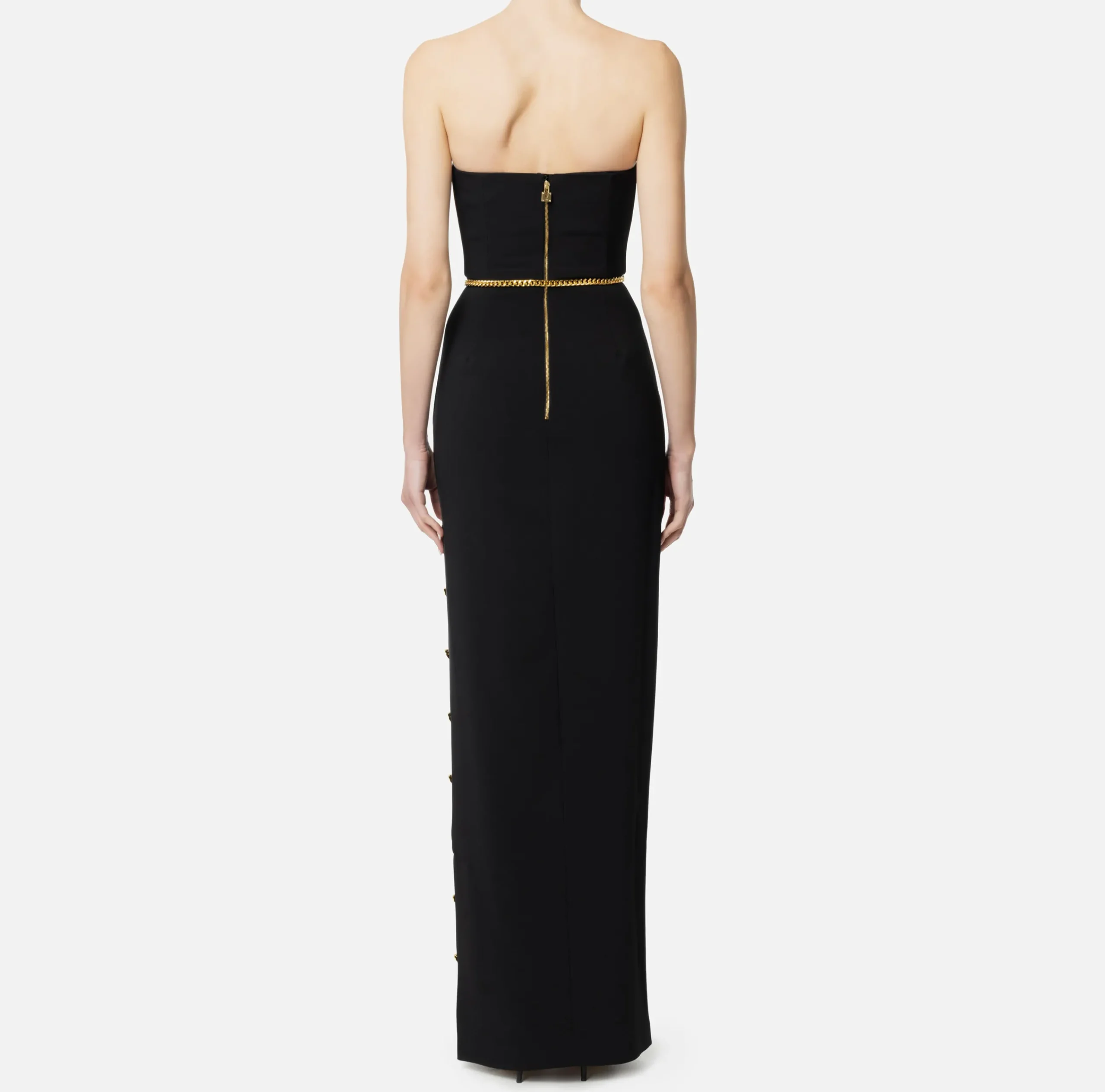 Abito red carpet in crêpe stretch con corpetto bustier e gonna con alto spacco laterale rifinito da bottoni. Il punto vita è enfatizzato da cintura a catena in metallo dorato con charms logo.