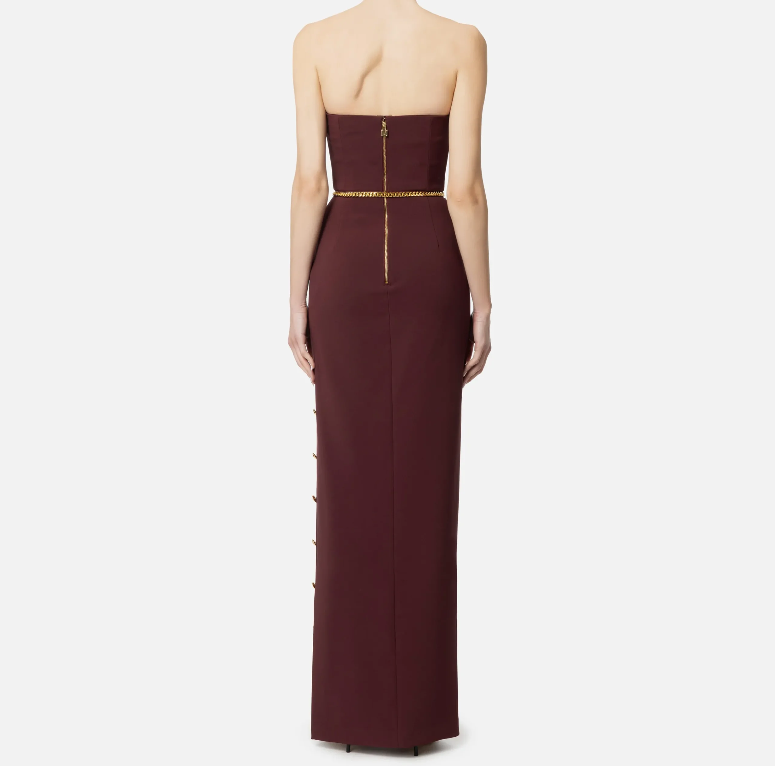 Abito red carpet in crêpe stretch con corpetto bustier e gonna con alto spacco laterale rifinito da bottoni. Il punto vita è enfatizzato da cintura a catena in metallo dorato con charms logo.