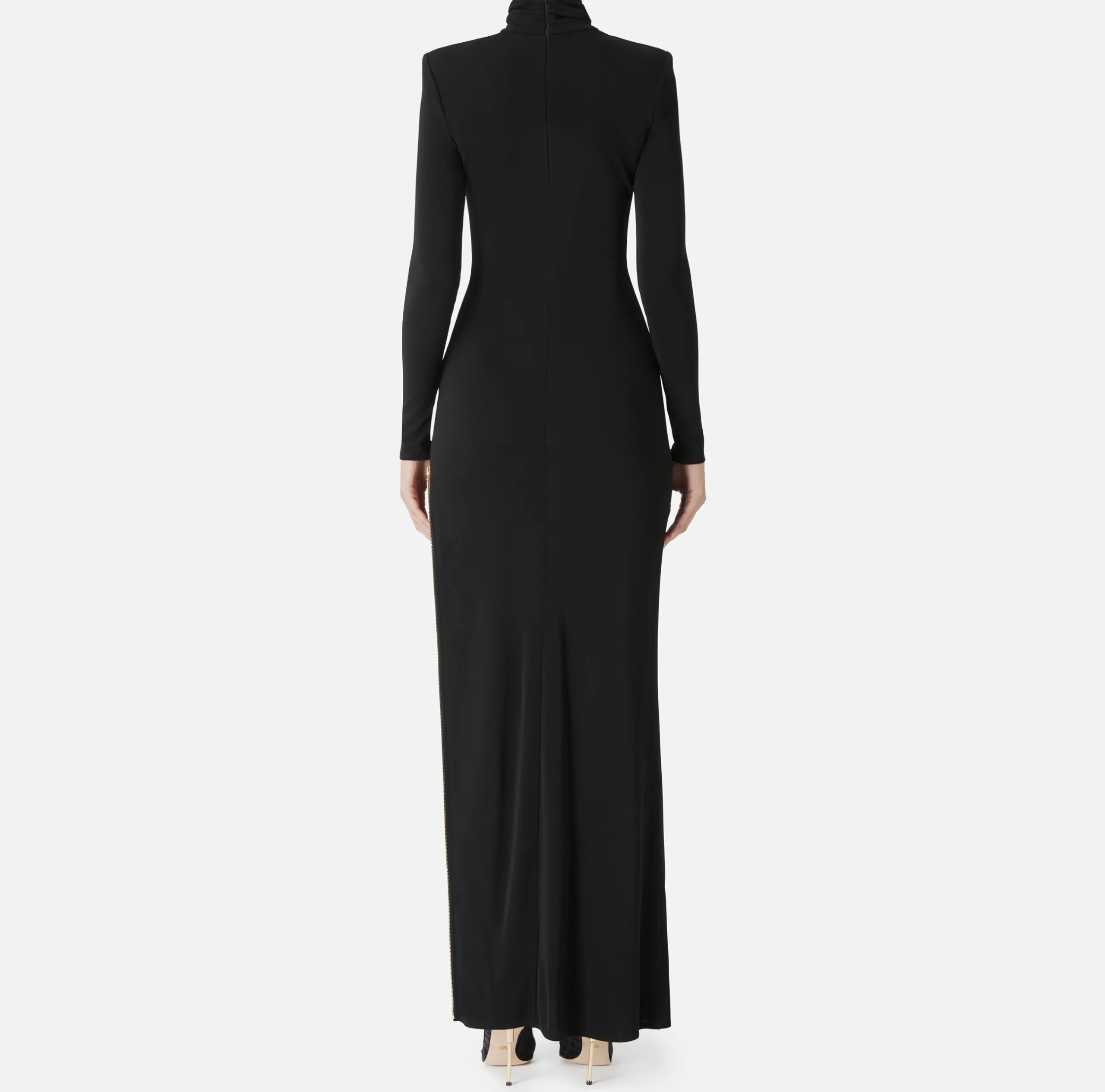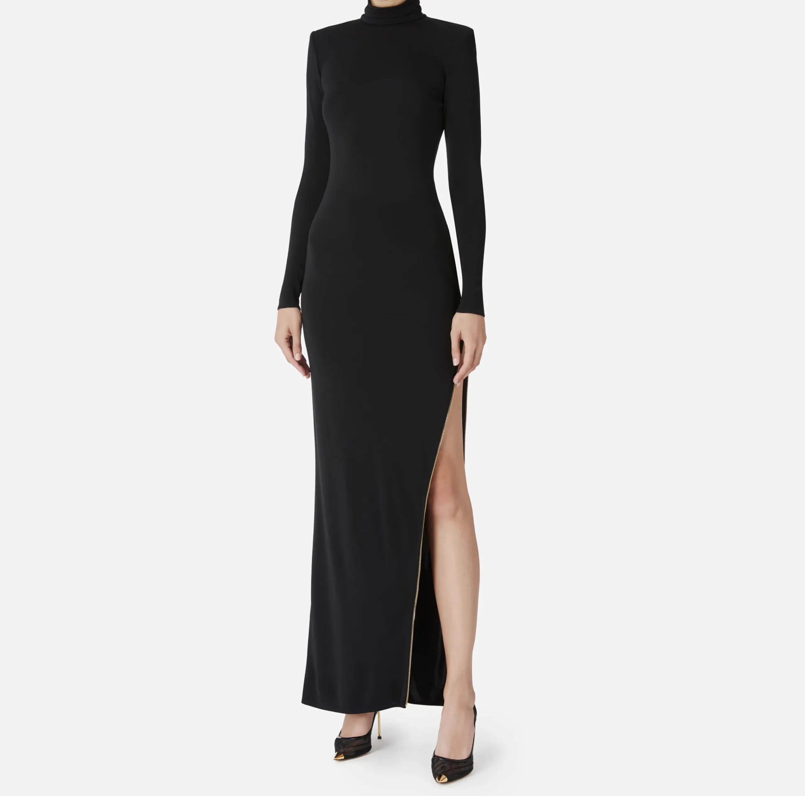 Abito red carpet in jersey crêpe con collo alto e maniche lunghe a guanto. È caratterizzato da profondo spacco laterale rifinito da zip in metallo dorato con tiretto logo.