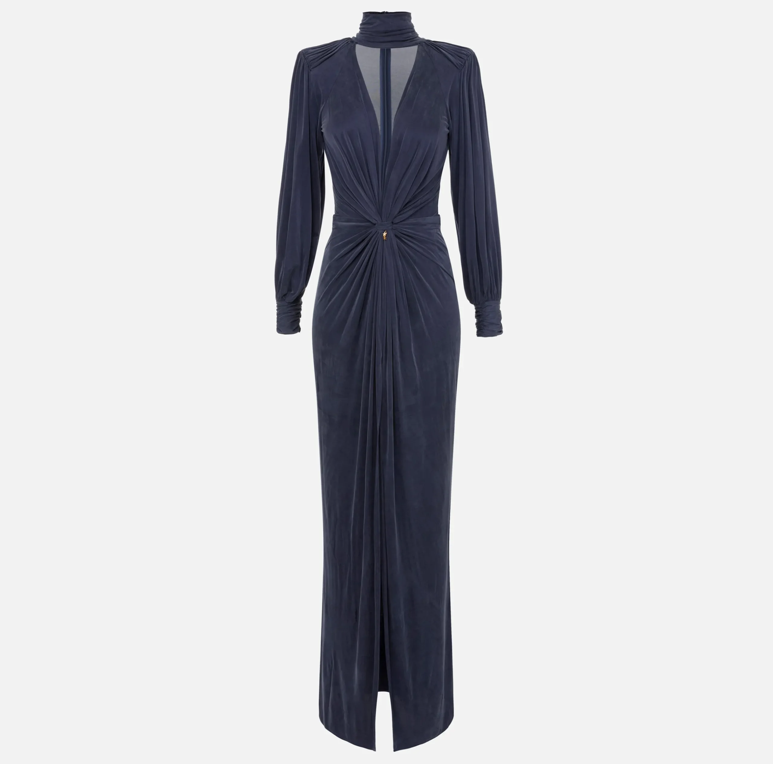 Abito red carpet in jersey cupro con collo alto e maniche lunghe ampie al fondo e arricciate sulle spalle. È caratterizzato da profonda scollatura trattenuta da un nodo drappeggiato e gonna con spacco nel centro davanti.