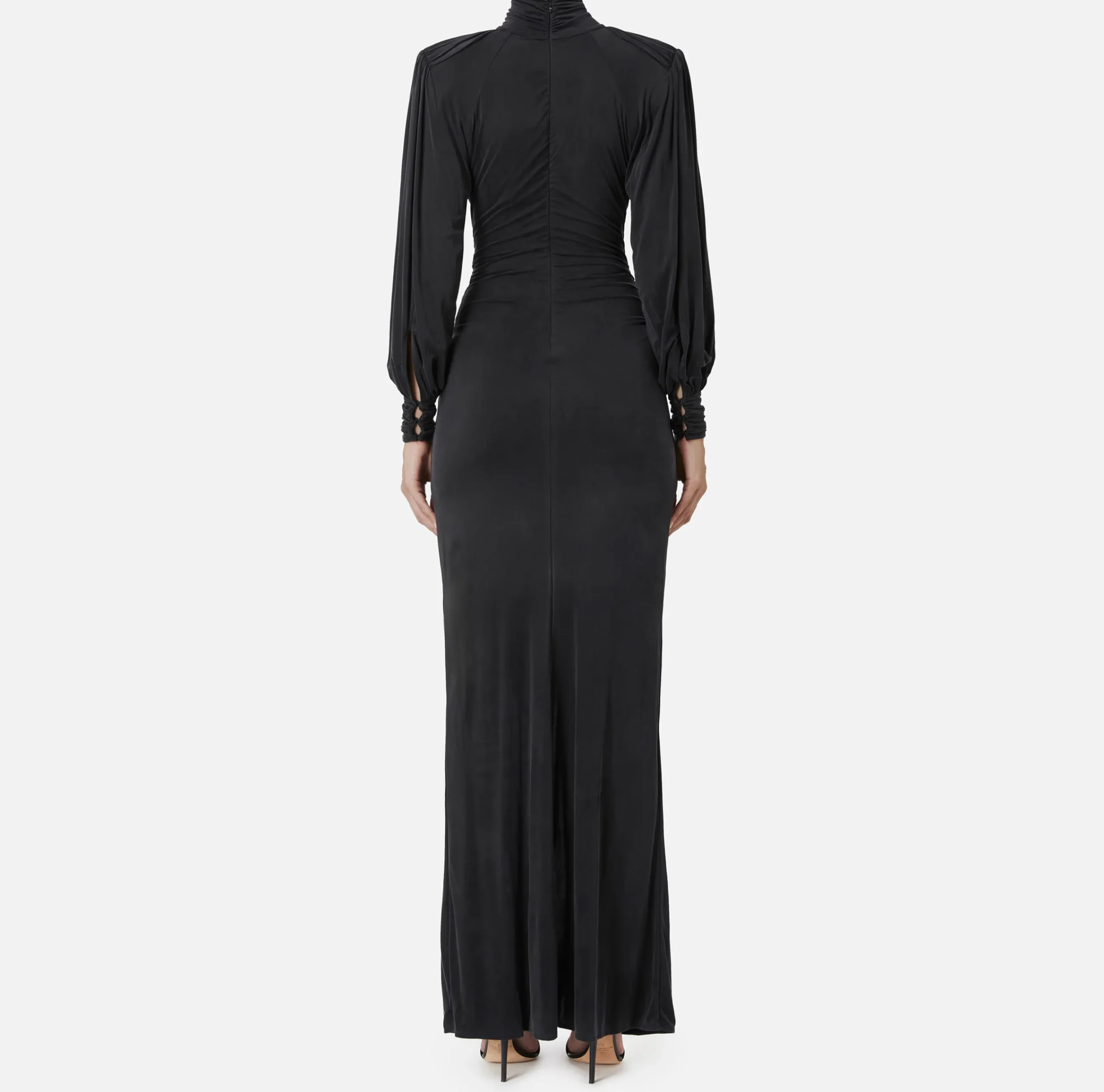 Abito red carpet in jersey cupro con collo alto e maniche lunghe ampie al fondo e arricciate sulle spalle. È caratterizzato da profonda scollatura trattenuta da un nodo drappeggiato e gonna con spacco nel centro davanti.