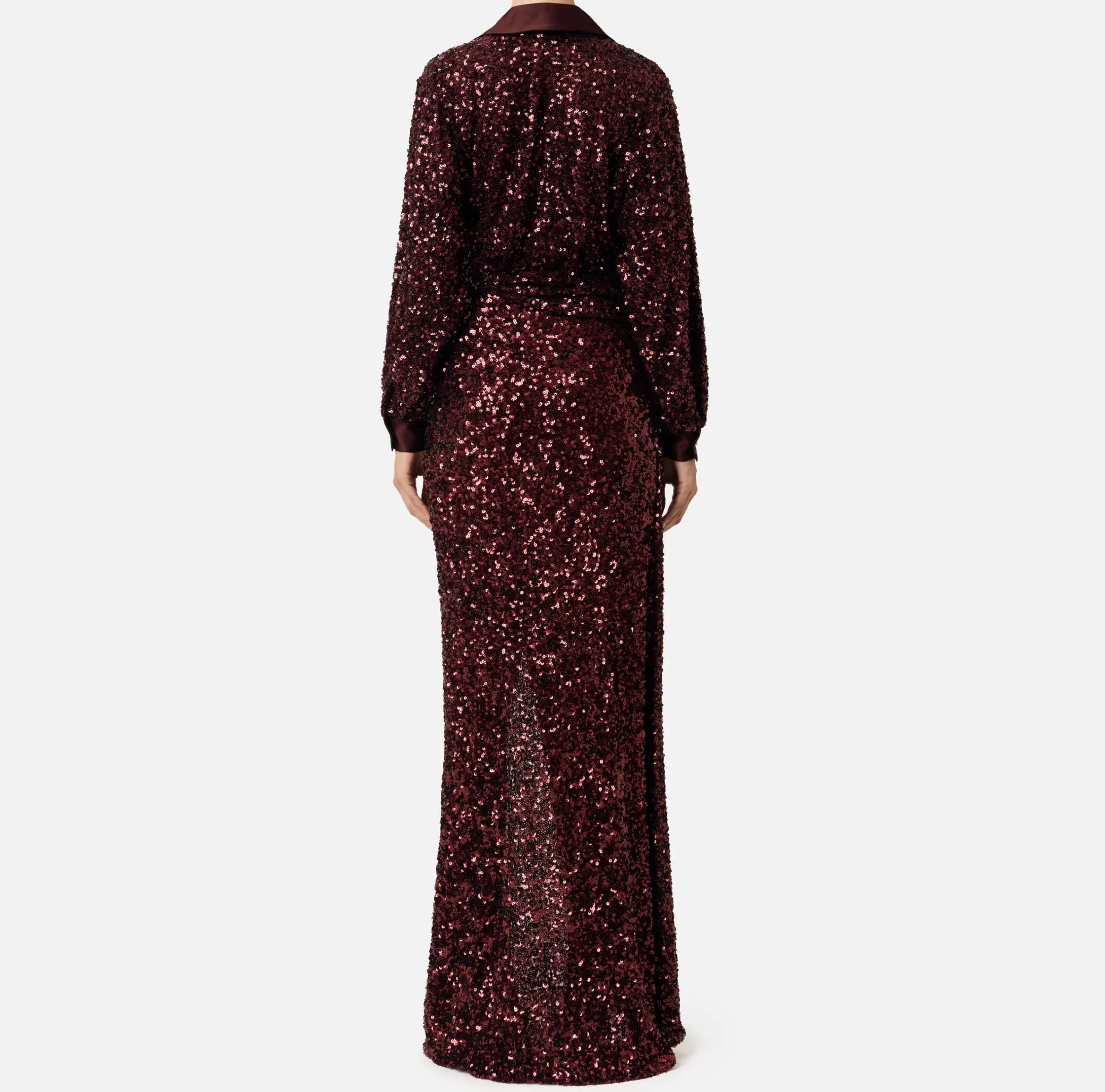 Abito red carpet in paillettes a maniche lunghe con polsi in raso ludico e scollo a camicia. È caratterizzato da profondo spacco laterale.