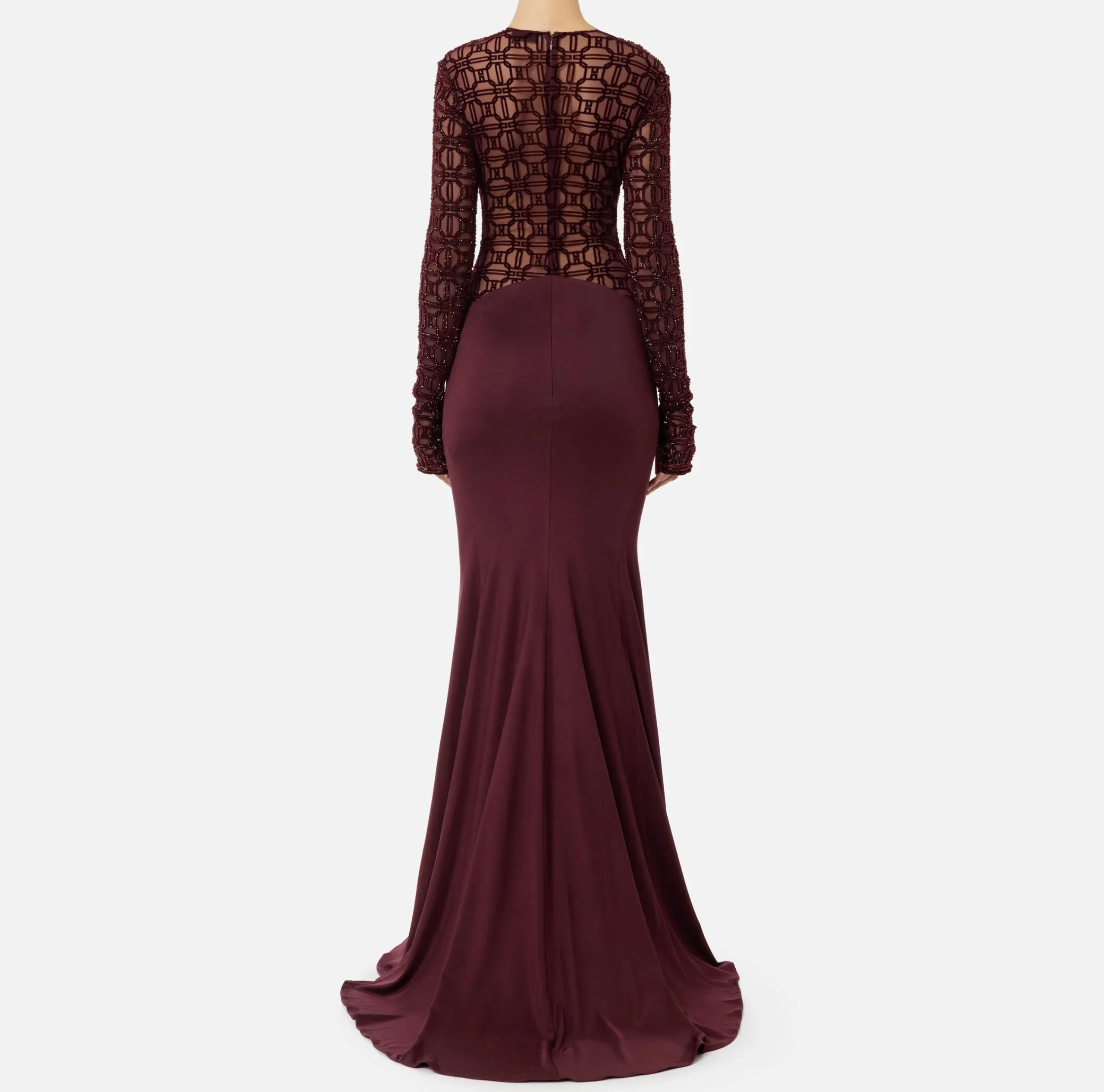 Abito red carpet in jersey crêpe a maniche lunghe con scollo a giro. È caratterizzato da corpetto aderente in tulle ricamato di micro strass con taglio stondato al fondo.