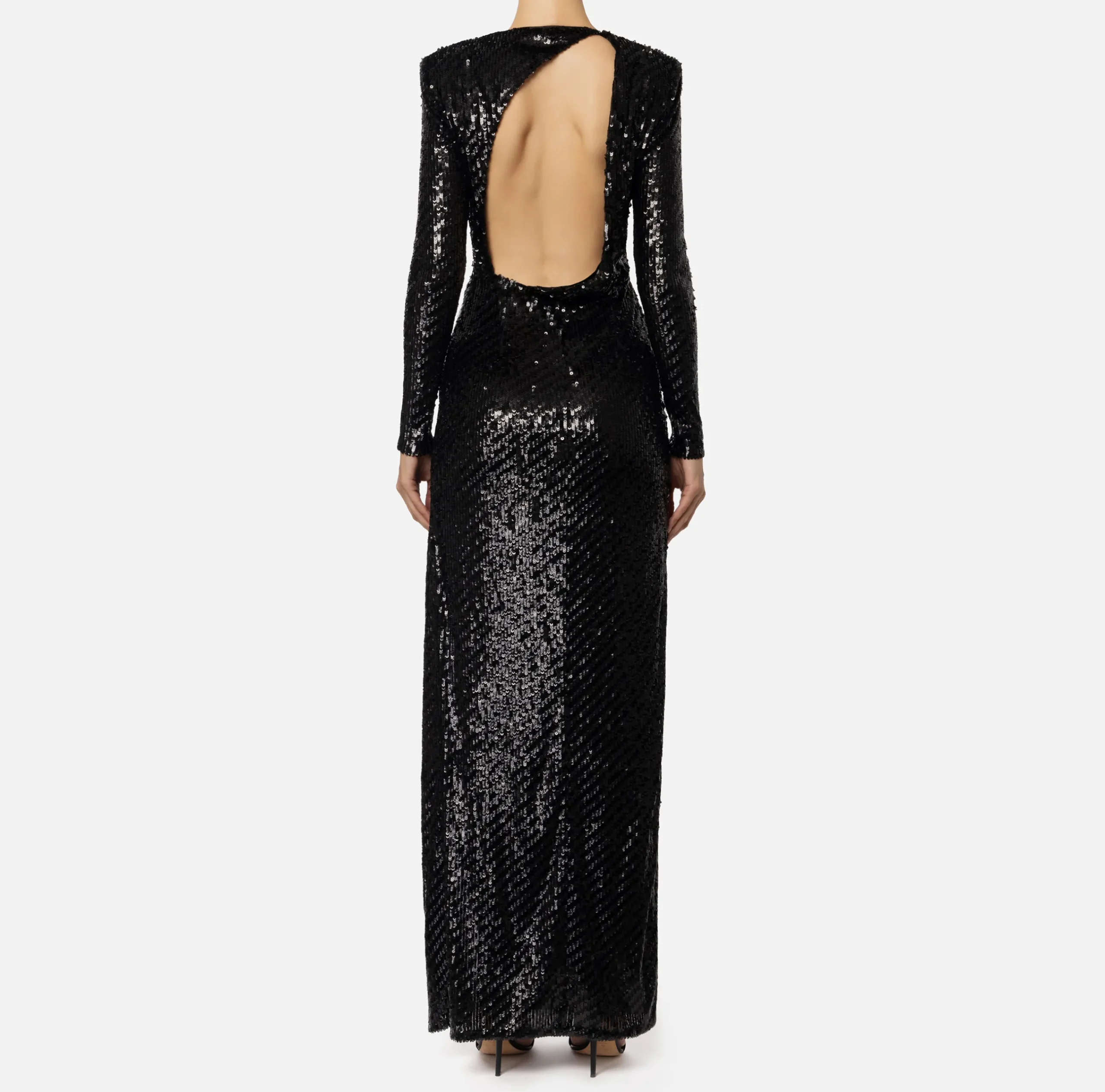 Abito red carpet in tulle interamente ricamato a mano con paillettes di sbieco. È caratterizzato da maniche lunghe, cut-out asimmetrico sulla schiena e profondo spacco laterale.