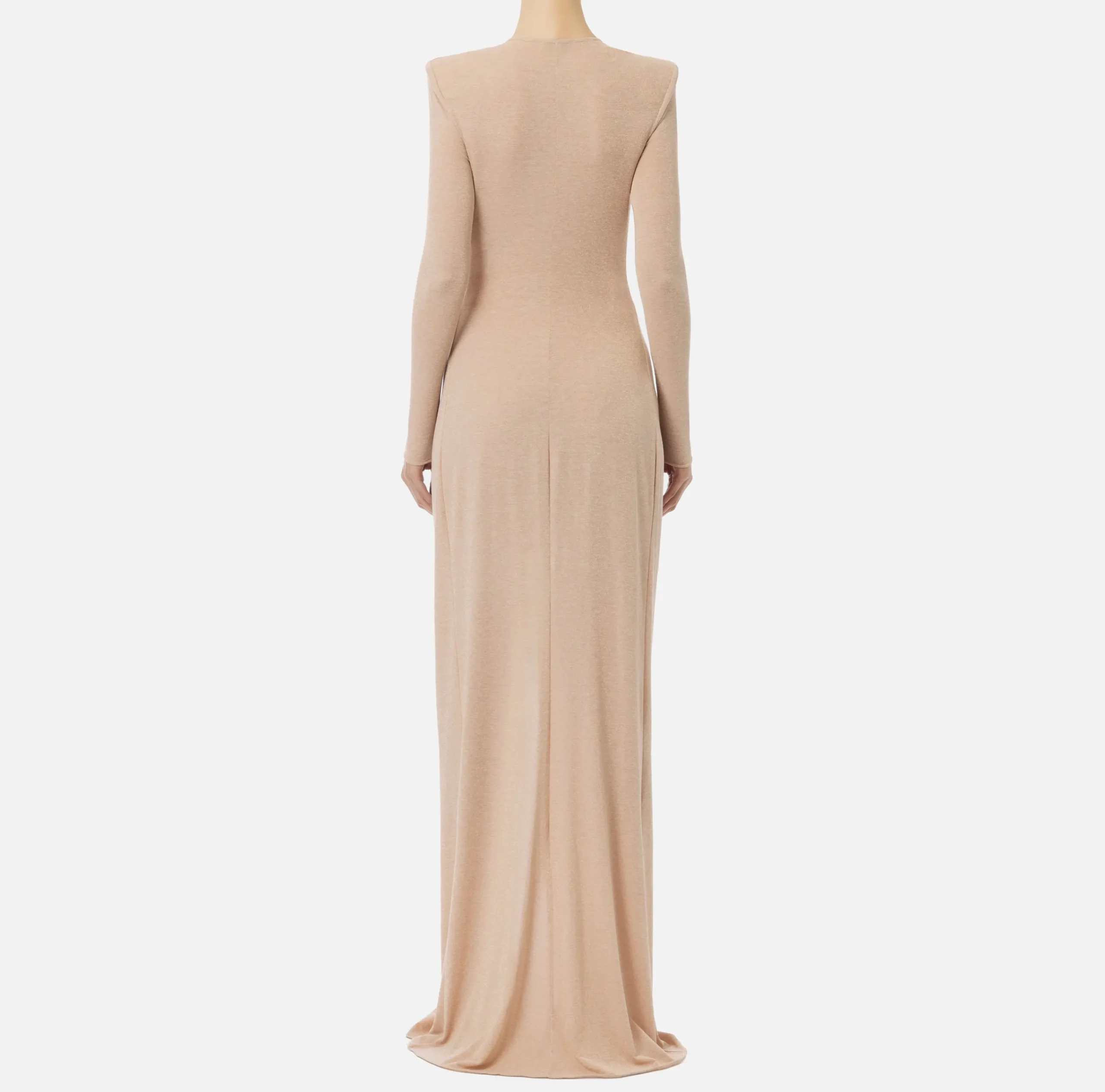 Abito red carpet in jersey lurex a maniche lunghe con gonna con spacco nel centro davanti. È caratterizzato da profonda scollatura trattenuta da un nodo drappeggiato e da un accessorio logo in metallo dorato e strass.