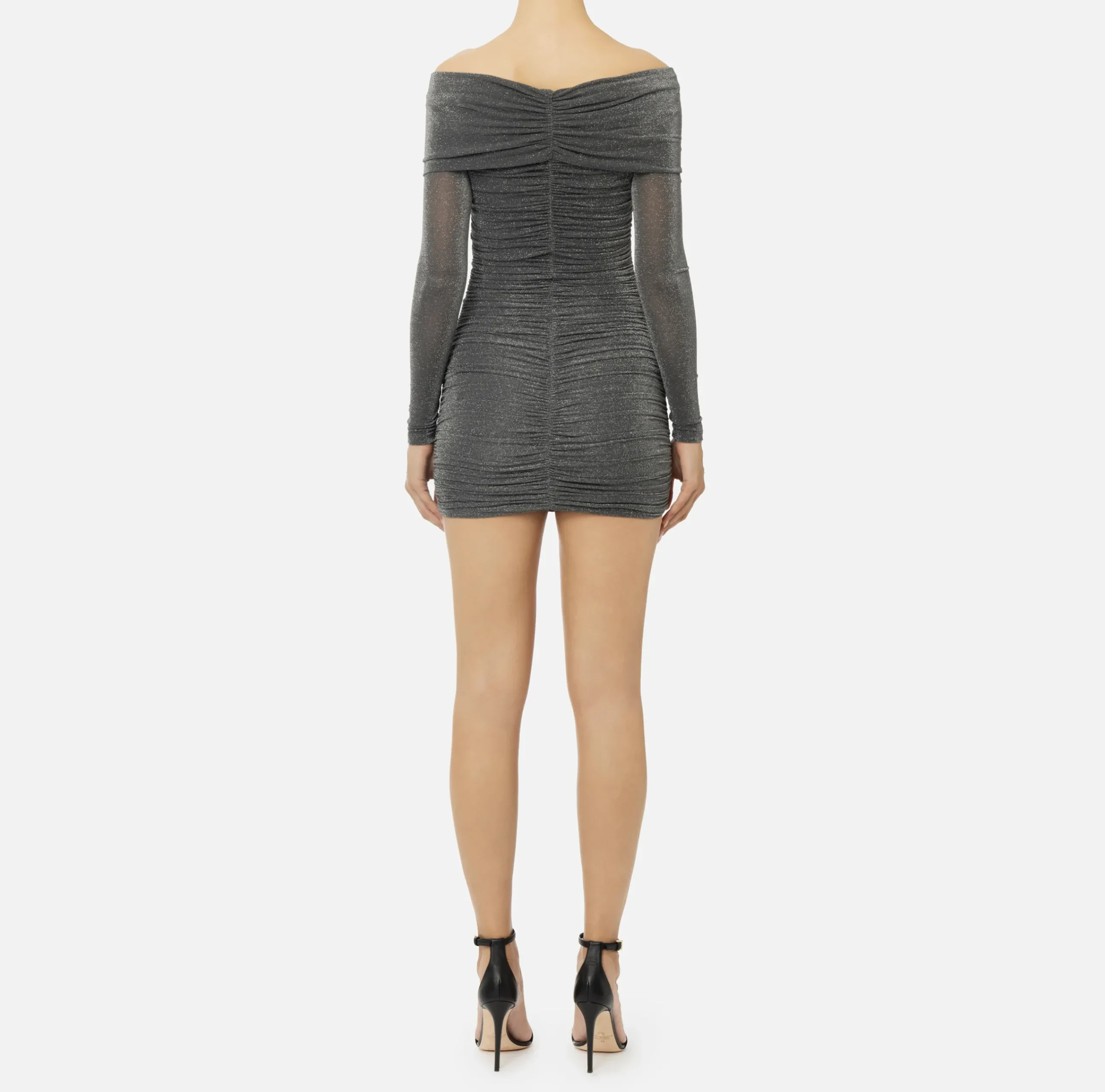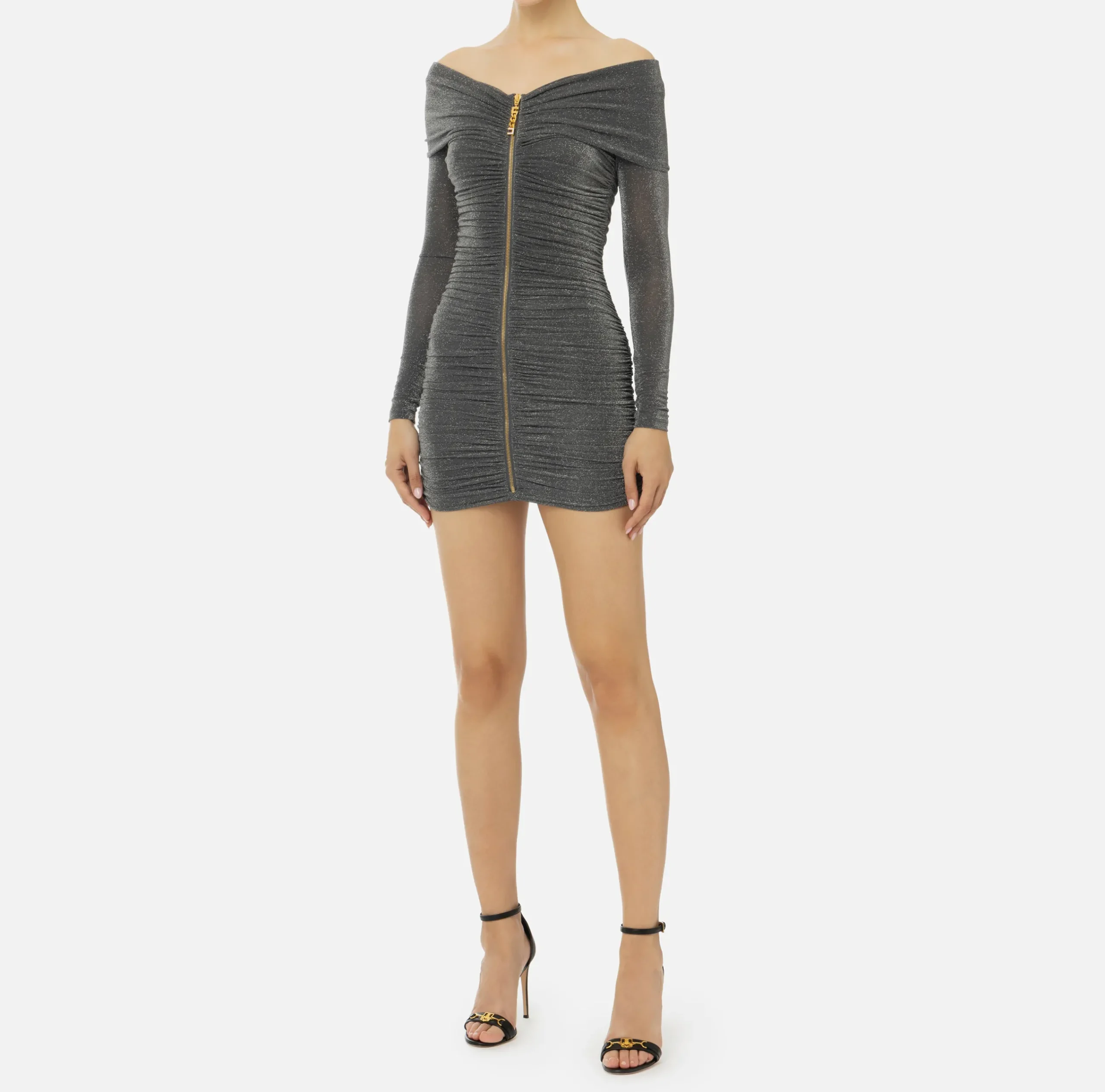 Miniabito in jersey lurex a maniche lunghe a guanto con scollo a barca che scopre le spalle. È caratterizzato da zip con tiretto logo in metallo dorato nel centro davanti che crea un drappeggio su tutto il corpo.