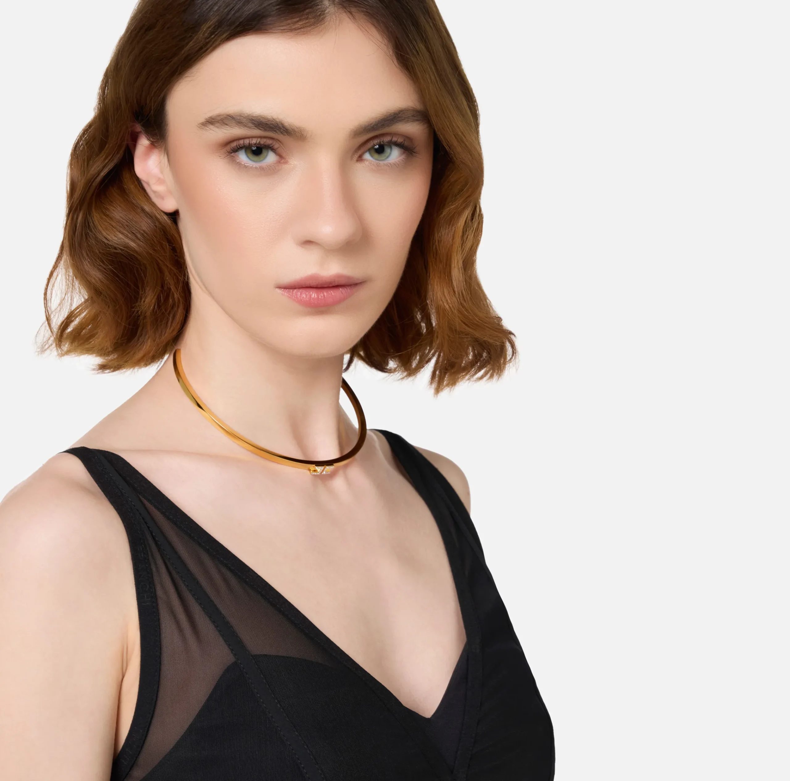 Collana choker rigida in metallo dorato con logo centrale in strass.