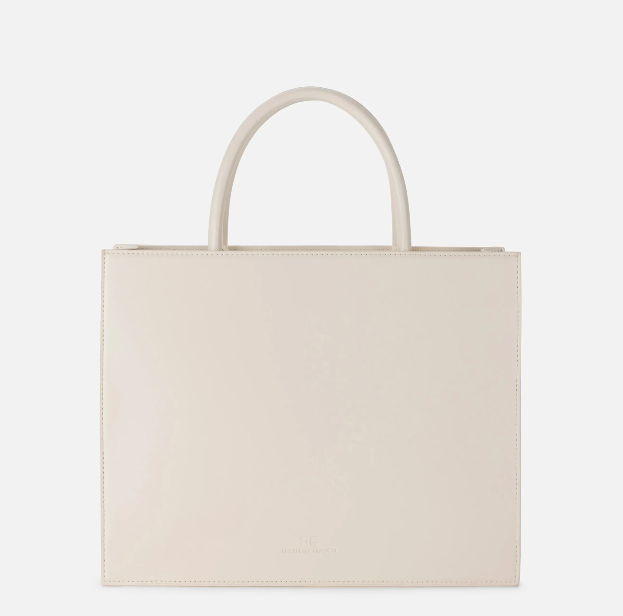 Borsa a mano media in materiale sintetico effetto spazzolato con chiusura a zip. È caratterizzata da maxi placca EF in metallo dorato e logo doppia C fasciato. Include tracolla di servizio per portabilità a spalla.