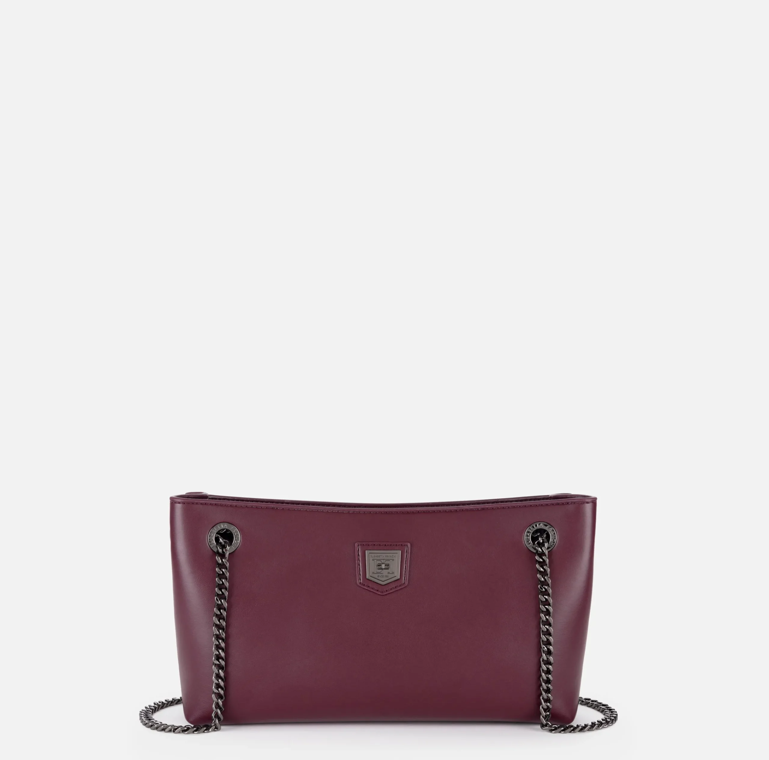 Borsa a tracolla in materiale sintetico effetto pelle. È caratterizzata da chiusura a magnetica, scudetto logo in metallo silver e tracolla in catena regolabile.