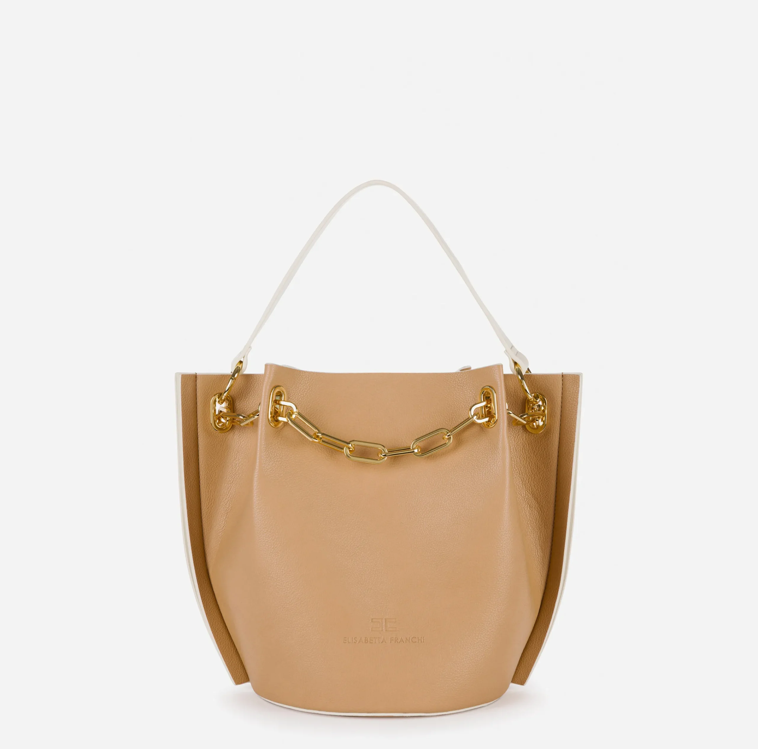 Secchiello Dune Elisabetta Franchi dalle dimensioni medie, con stracca per indossarla sia a mano che a spalla. Una borsa daily da utilizzare per completare un outfit raffinato e di classe pronto per non passare inosservata. Il dettaglio light gold della catena impreziosisce la borsa dalla lavorazione artigianalmente complessa.