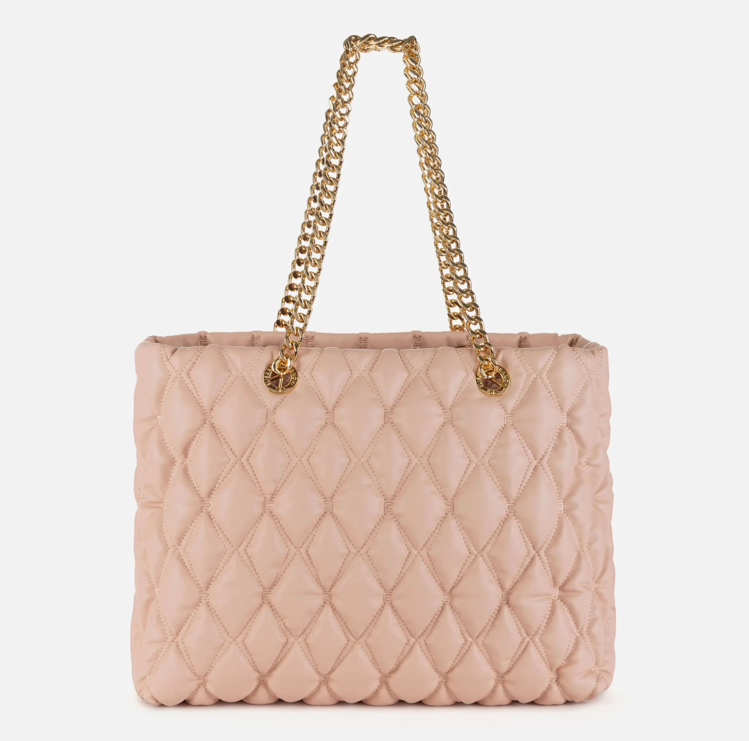 Shopper in materiale sintetico effetto pelle con lavorazione embossed con manici in catena in metallo dorato. È caratterizzata da placca logo in metallo dorato.