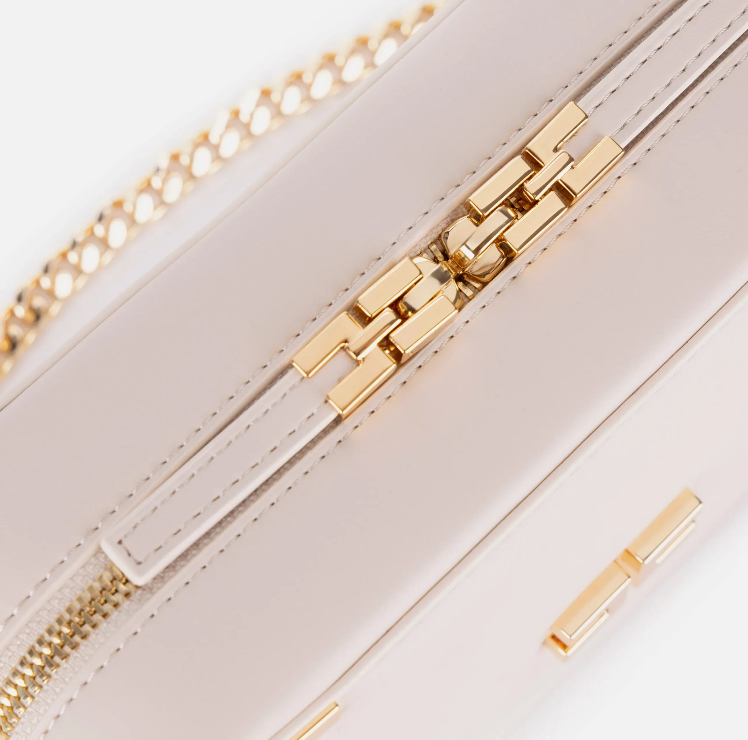 Borsa a tracolla in materiale sintetico effetto pelle. È caratterizzata da tracolla in catena, angoli in metallo e placca logo in metallo dorato.