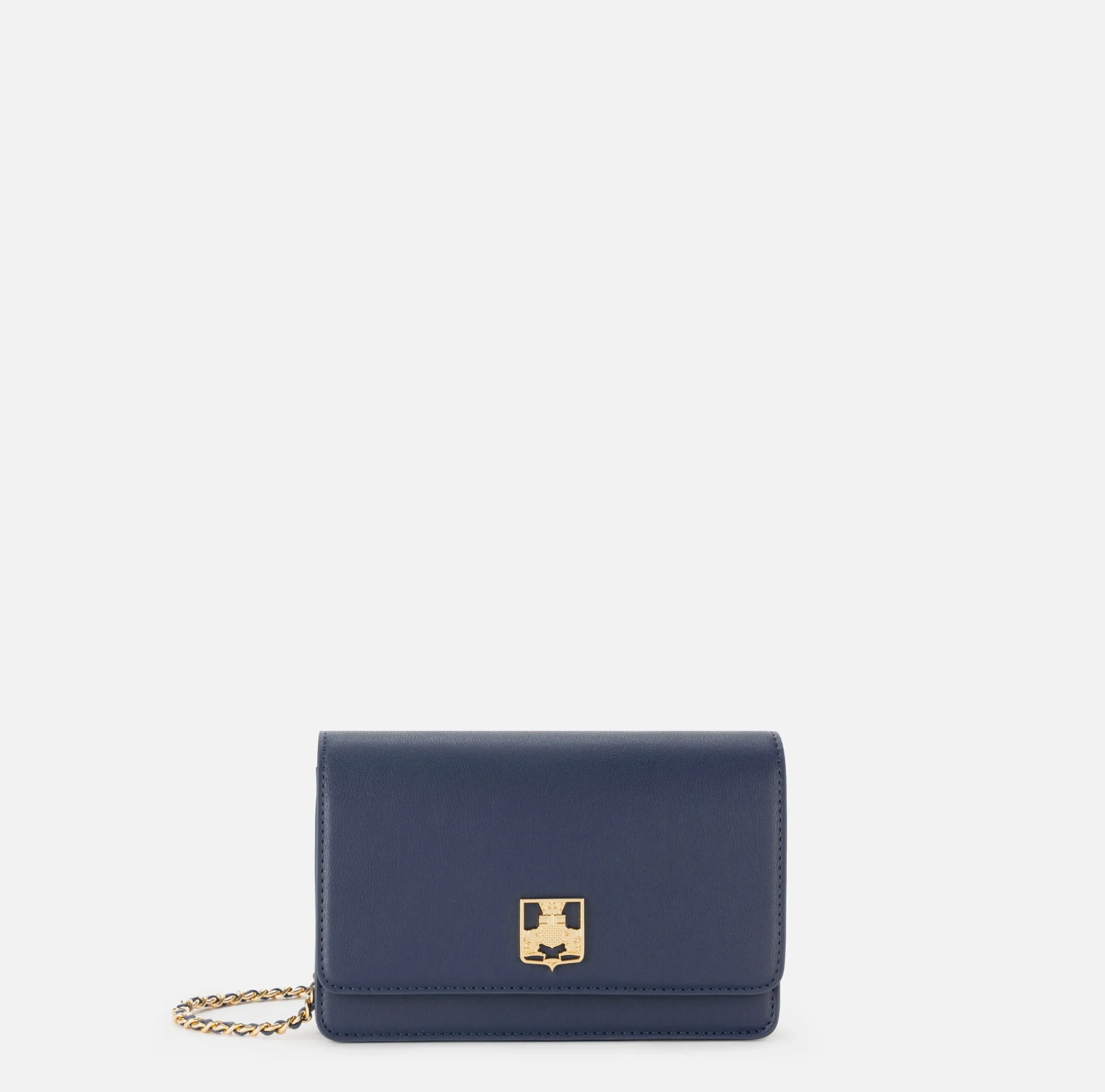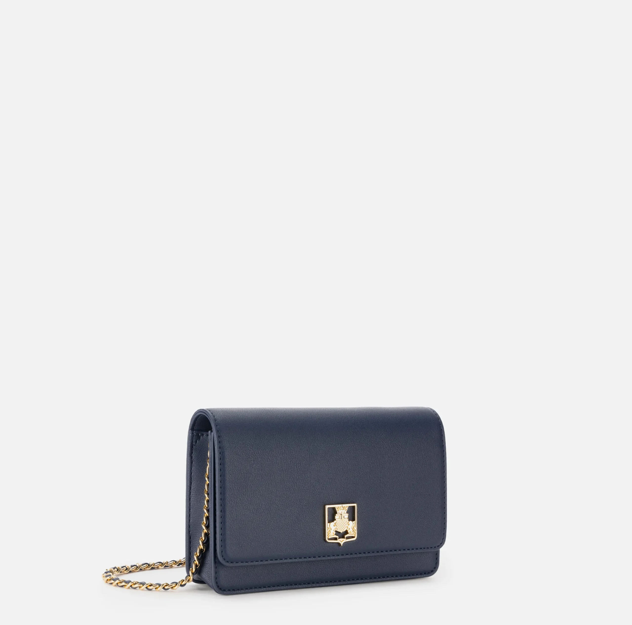 Borsa a tracolla in materiale sintetico effetto pelle. È caratterizzata da patta con placca logo in metallo dorato e tracolla in catena.