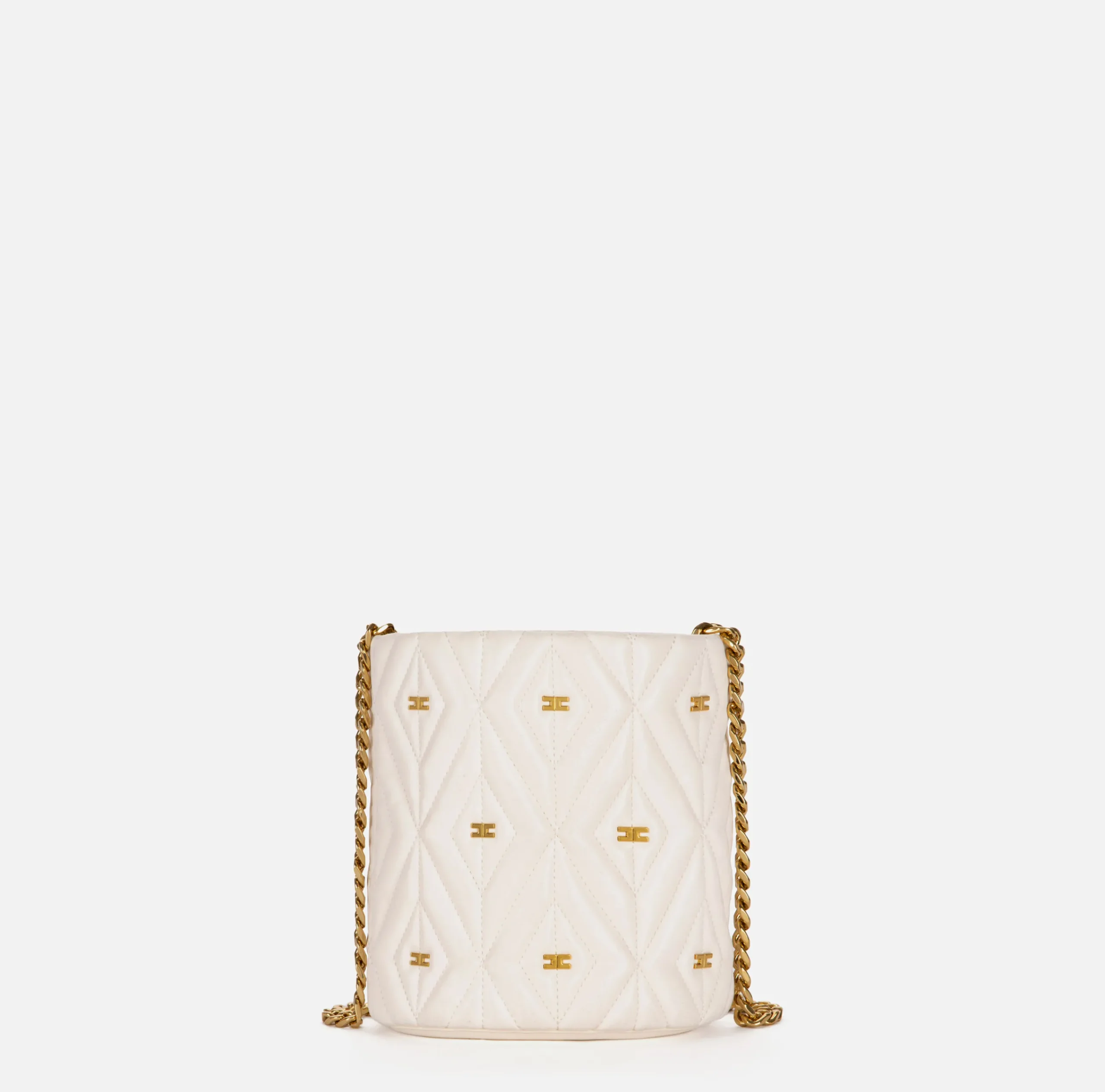 Secchiello in materiale sintetico effetto pelle. Superficie trapuntata e imbottita con un rivetto logato vintage colore oro al centro. Tracolla in catena