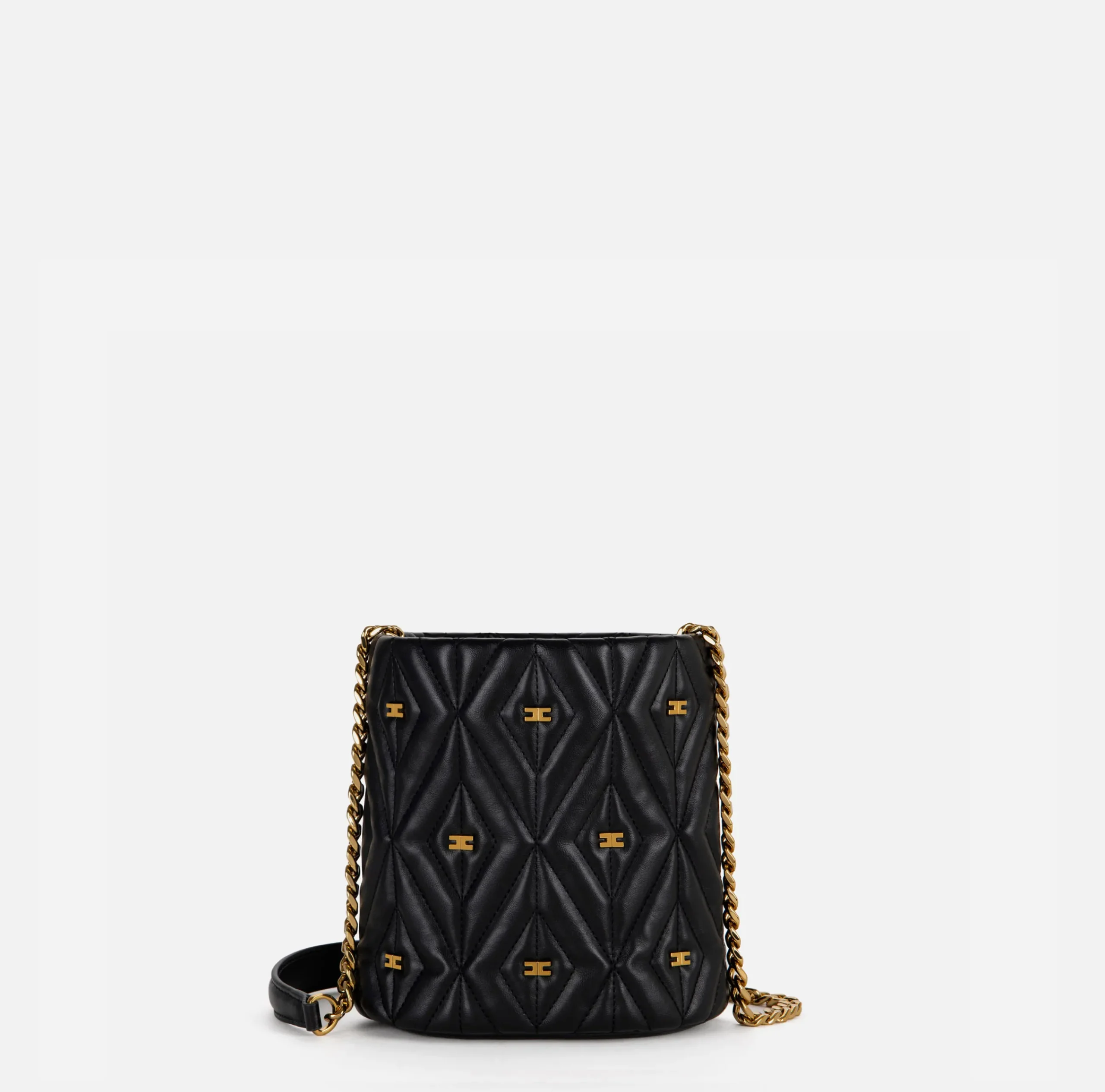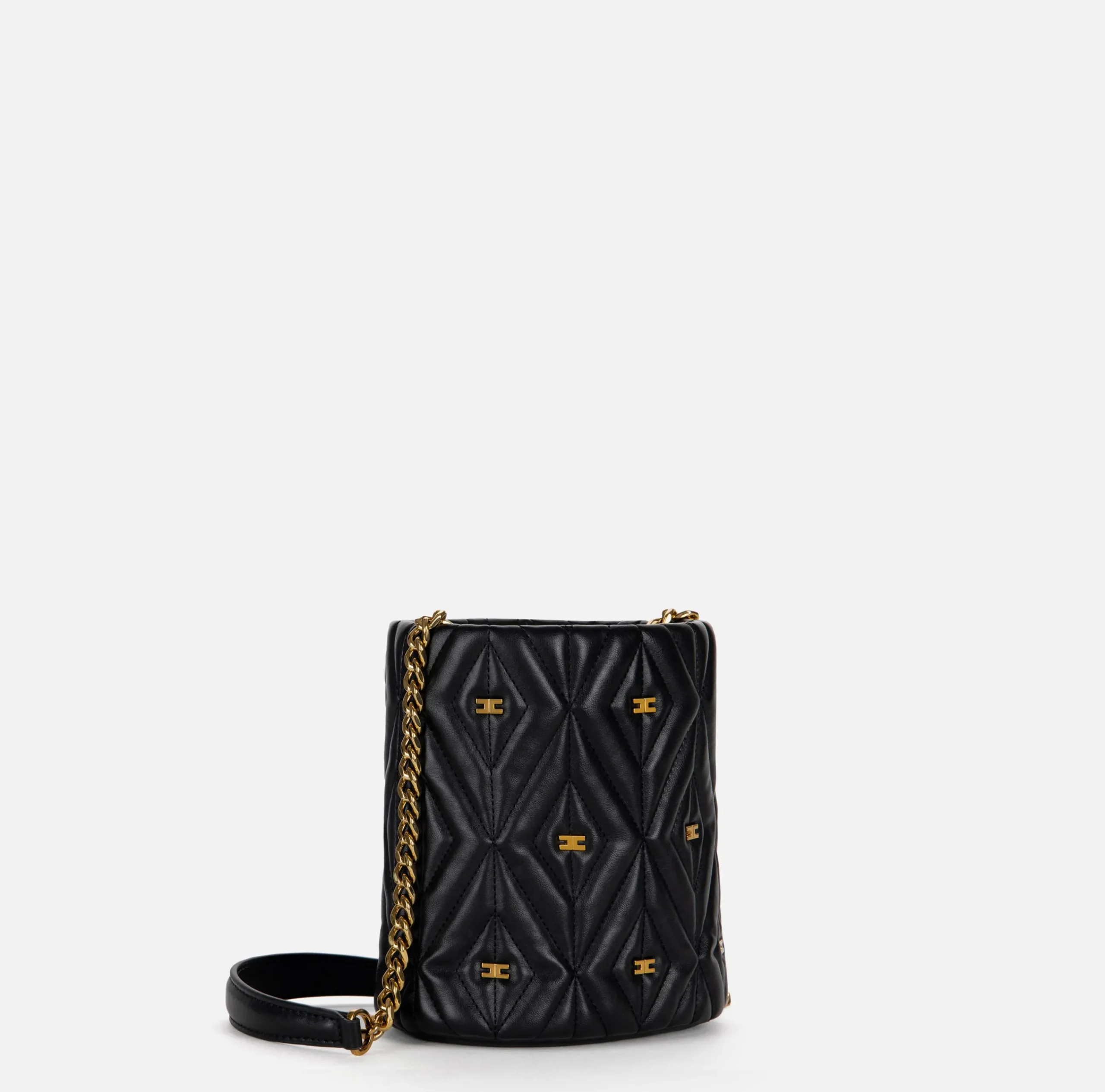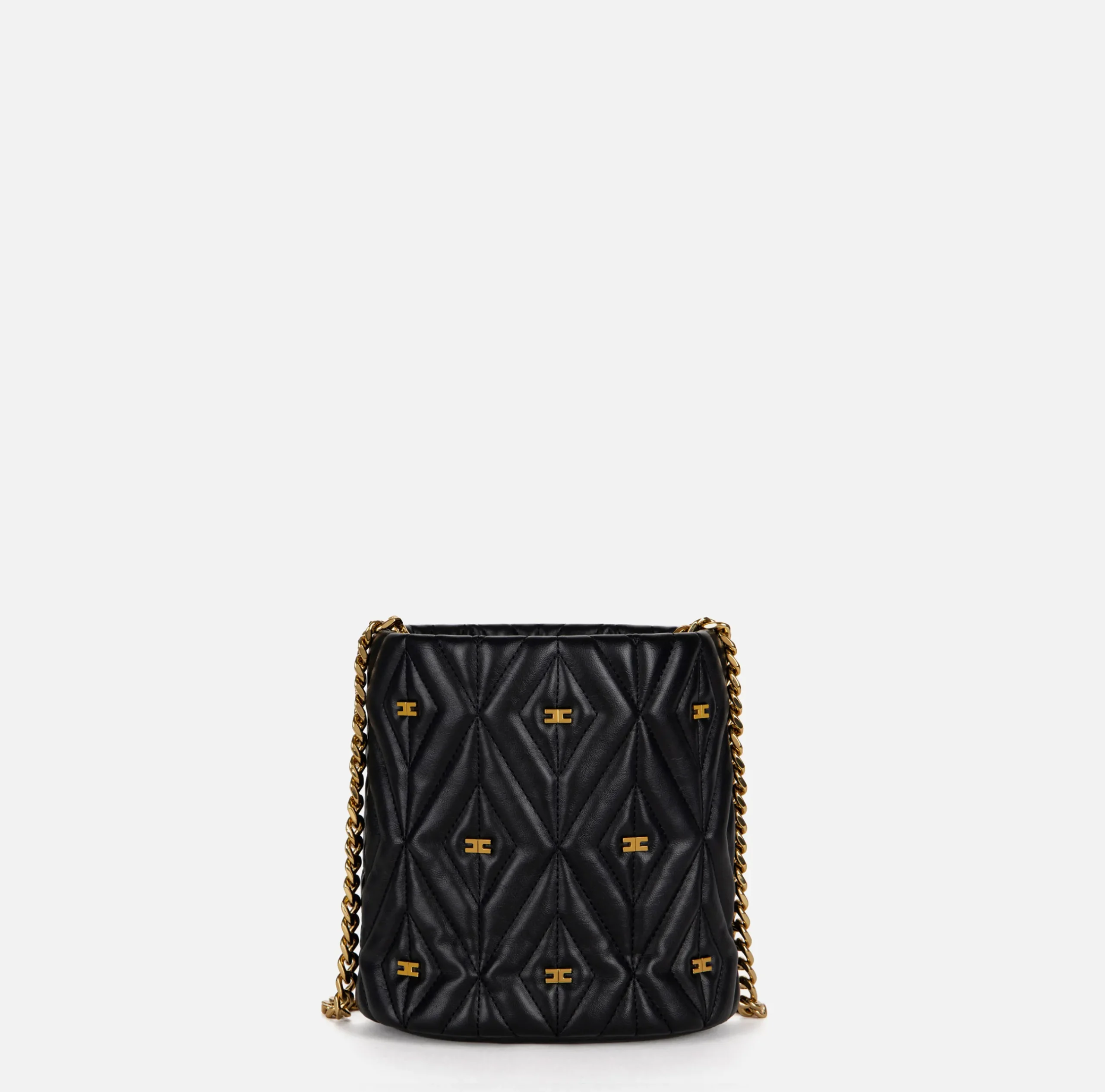 Secchiello in materiale sintetico effetto pelle. Superficie trapuntata e imbottita con un rivetto logato vintage colore oro al centro. Tracolla in catena