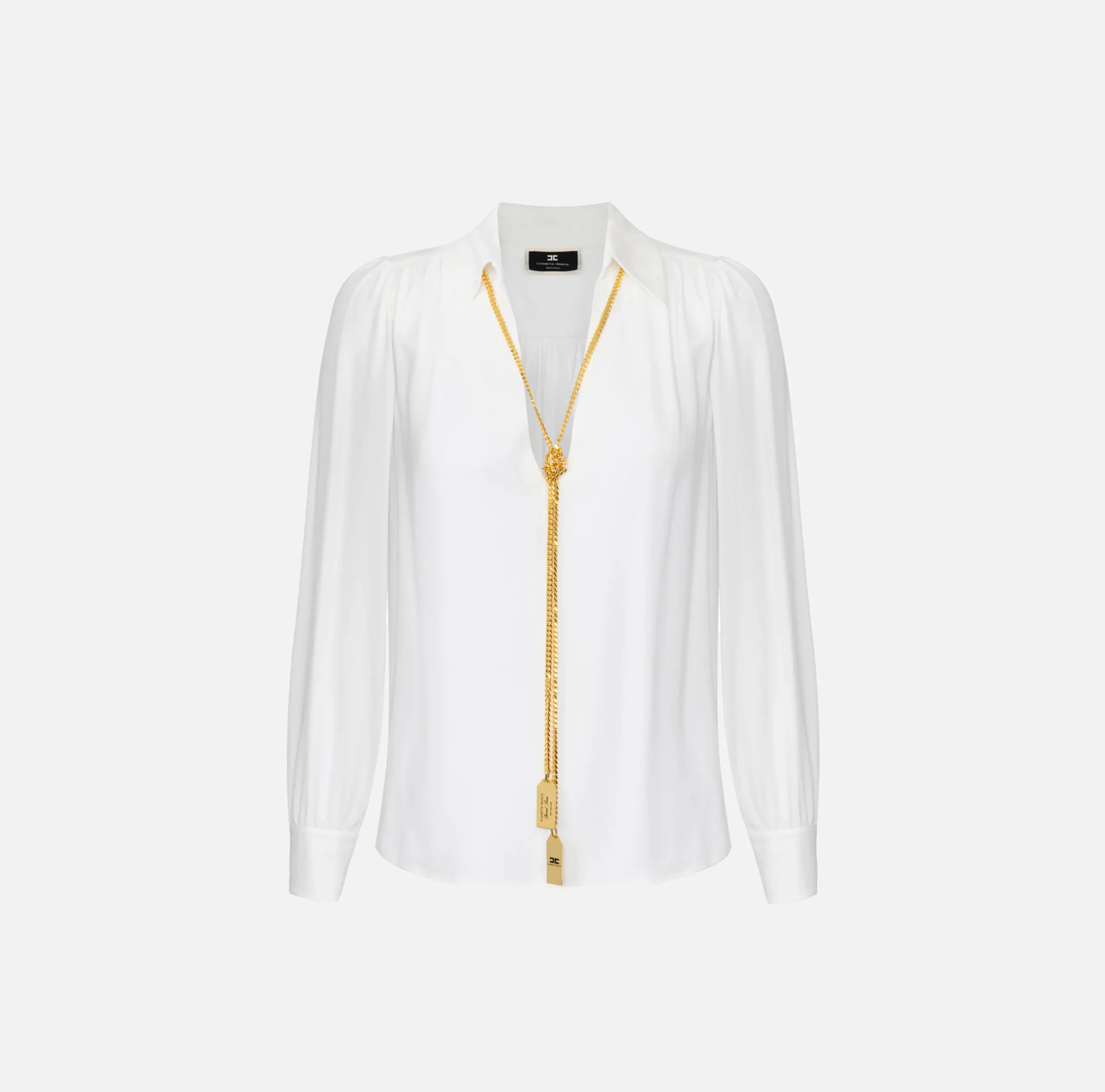 Camicia in doppia georgette a maniche lunghe con scollo a V e arricciatura sulle spalle. È caratterizzata da collana removibile con charms logo.