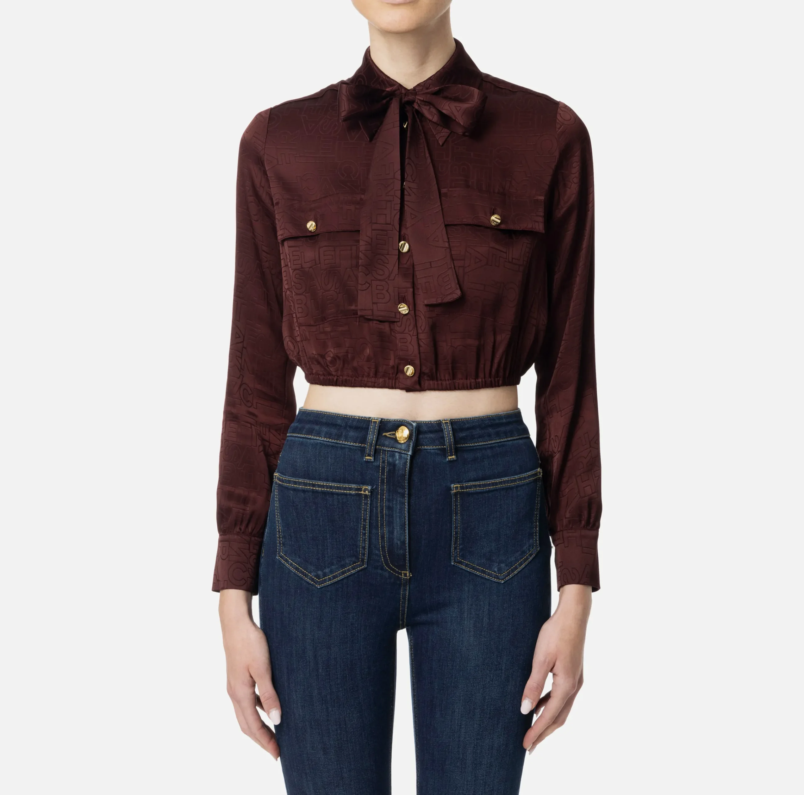 Camicia cropped in raso jacquard con maniche lunghe, tasche ad altezza seno e fondo elasticizzato. È caratterizzata da foulard da annodare al collo.