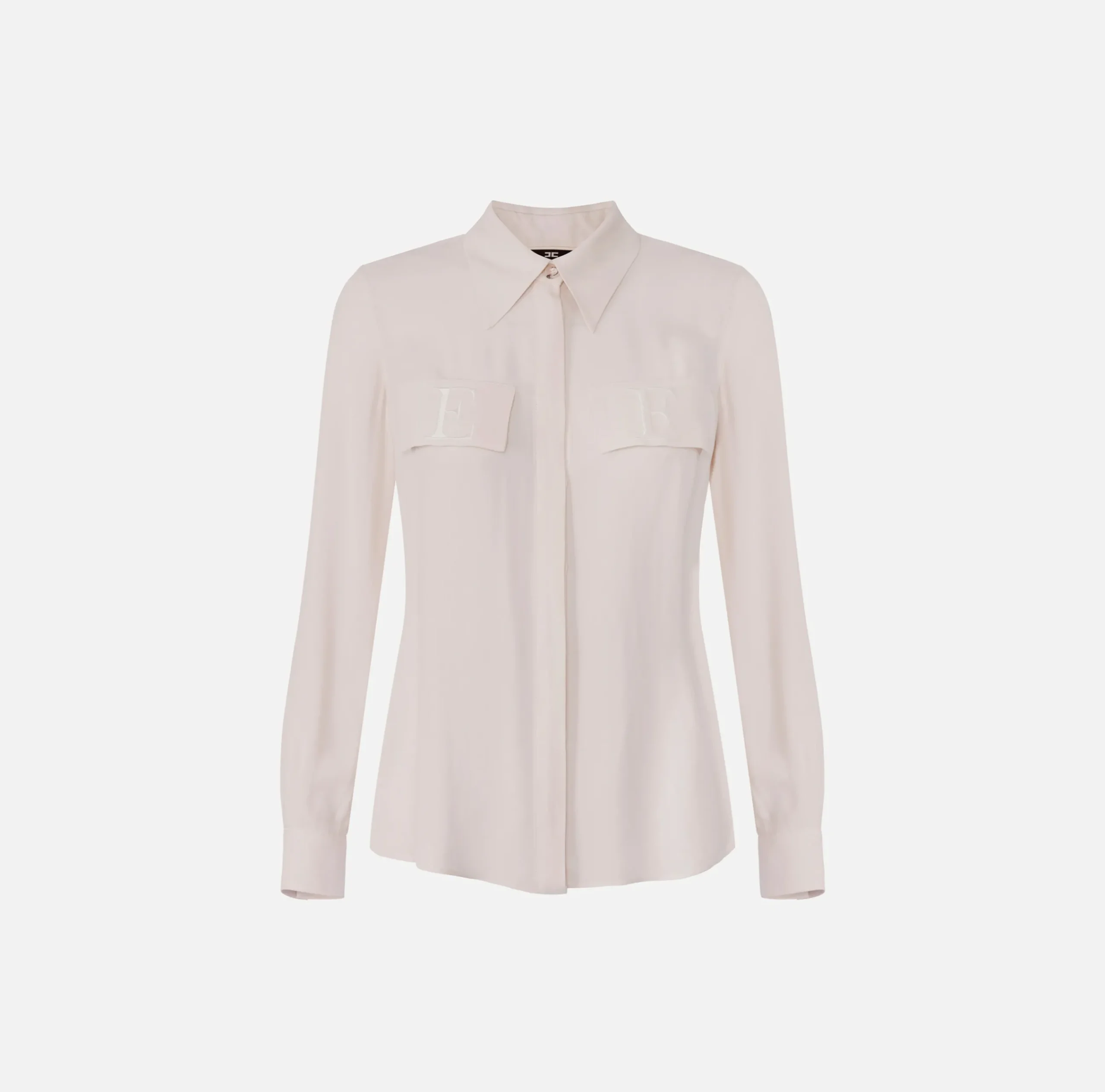 Camicia in doppia georgette con maniche lunghe. È caratterizzata da patte ad altezza seno con logo ricamato a filo in tono.