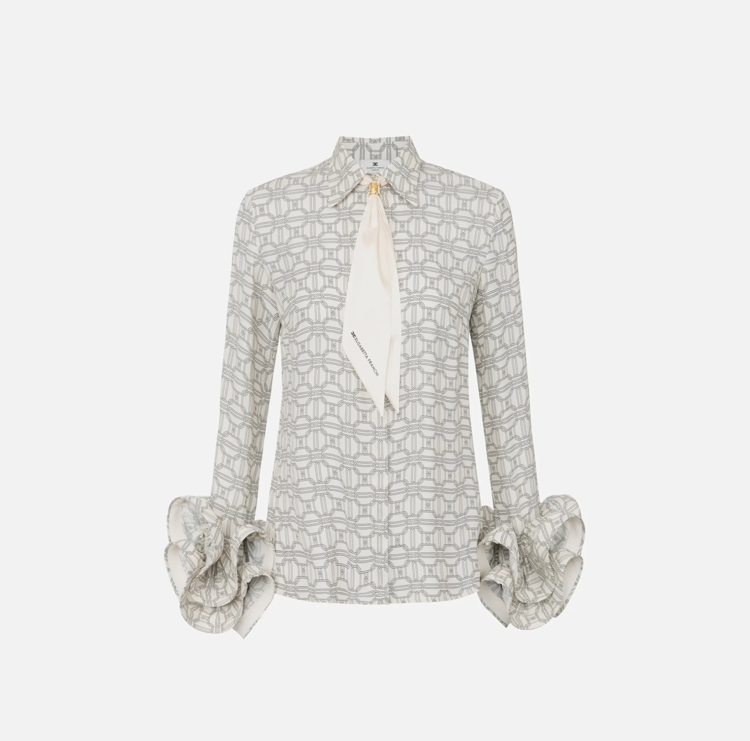 Camicia in georgette stampata a maniche lunghe con doppia ruches al fondo. È caratterizzata da foulard in twill con accessorio gioiello in metallo dorato.