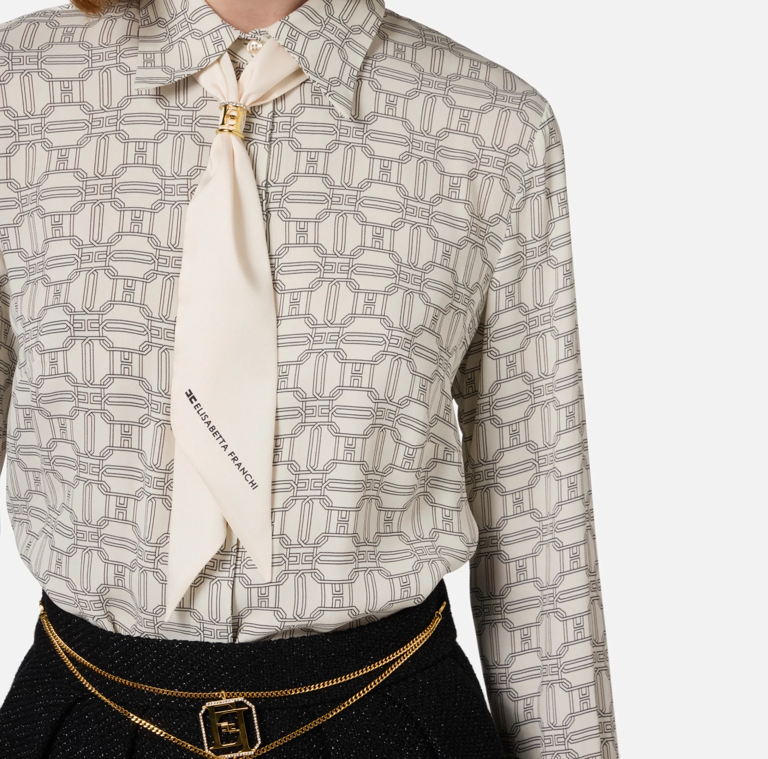 Camicie E Bluse|Elisabetta Franchi Camicia in georgette stampata con ruches e foulard Burro/Nero