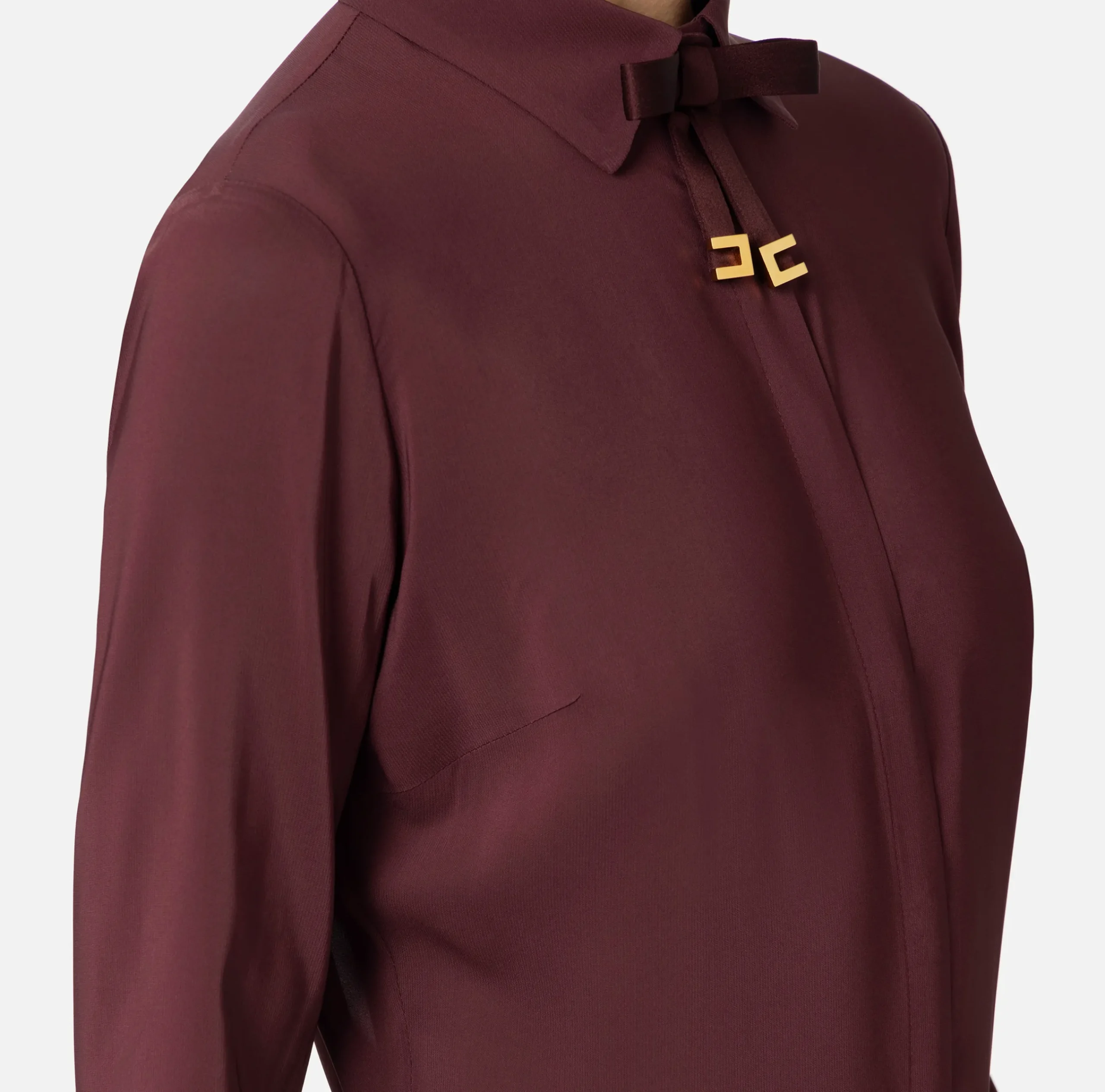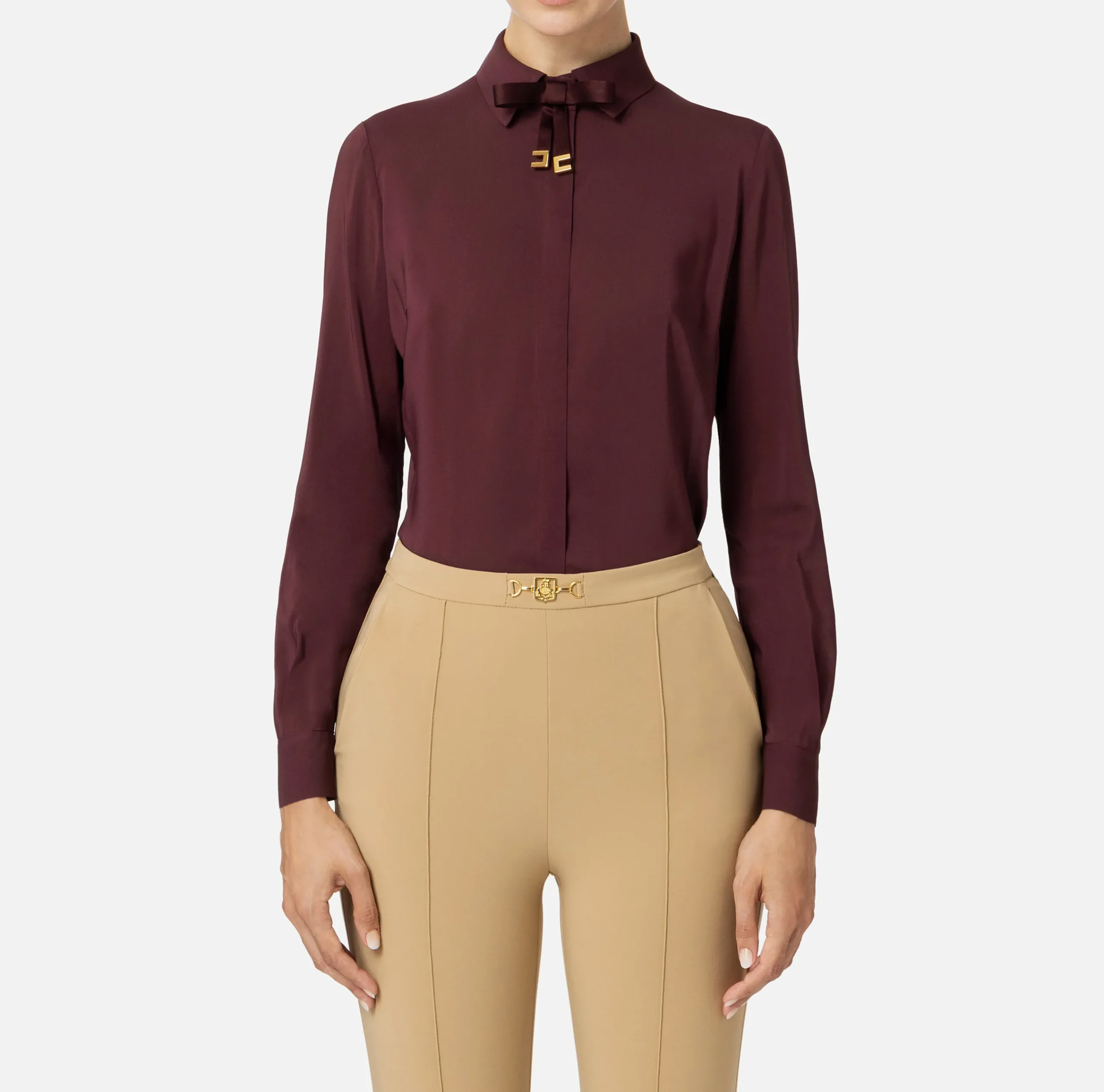 Camicia in georgette stretch a maniche lunghe con abbottonatura nascosta. È caratterizzata da un fiocco in raso con finalini in metallo dorato posizionato al collo.