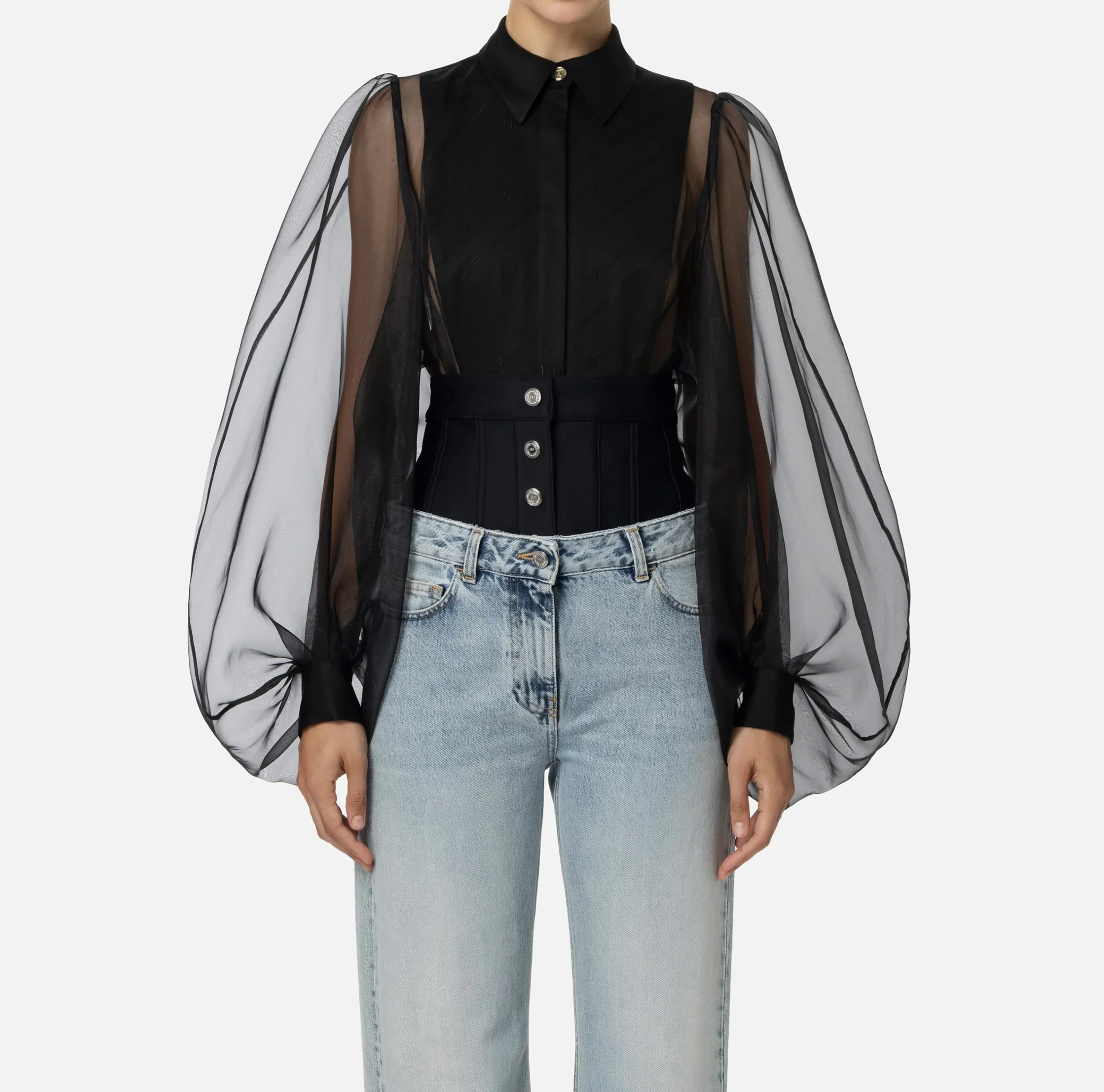 Camicia body in organza con maniche estremamente voluminose. È caratterizzata da collo e polsi in raso e plastron con pattern righe diagonali.