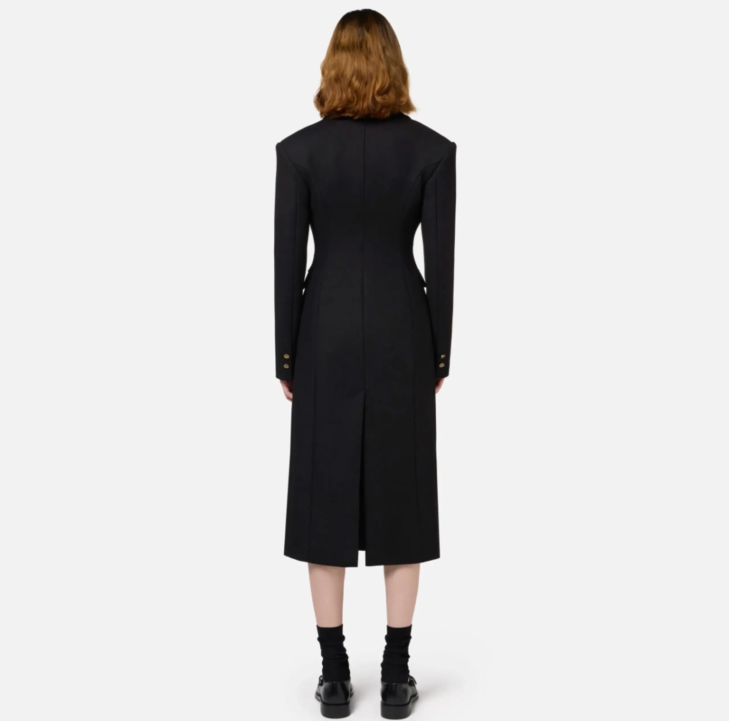 Cappotto in crêpe pesante con chiusura monopetto e tasche frontali a pattina. È caratterizzato da revers a lancia, spalle strutturate e sfiancatura al punto vita.