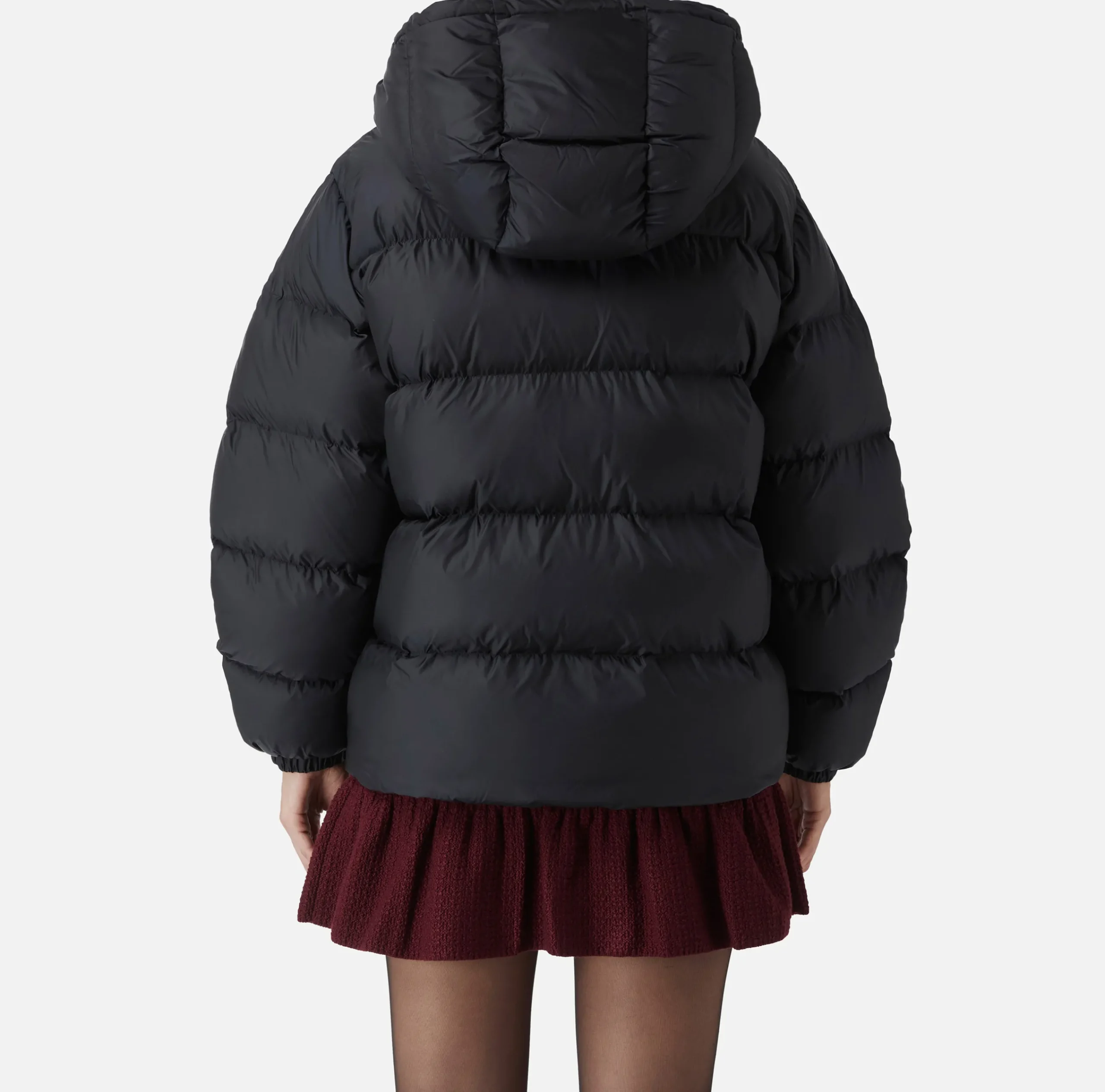 Piumino corto in nylon lucido voluminoso con impunture diagonali e collo a cratere. È caratterizzato da un ricamo stemma logo a filo in tono.