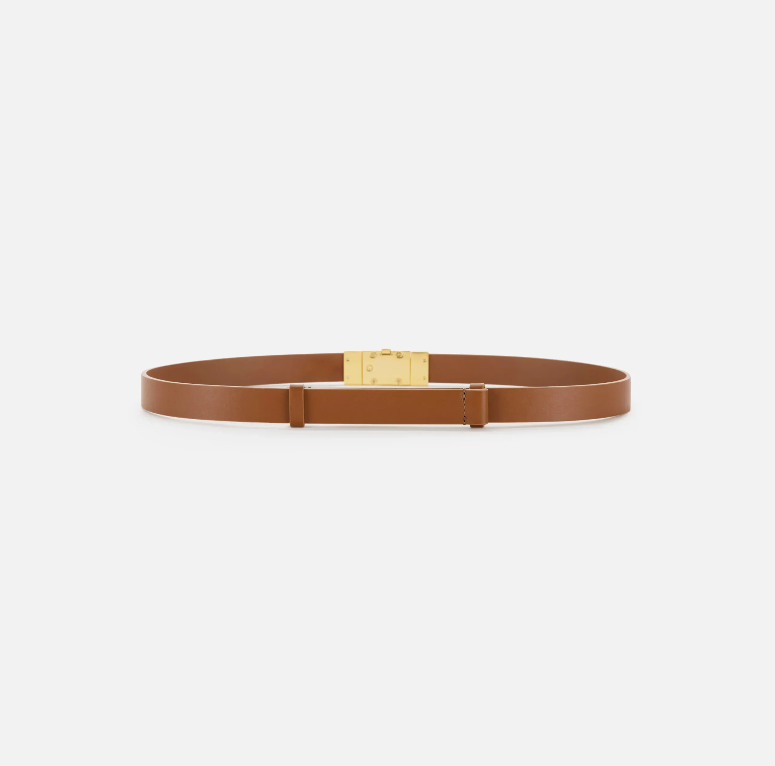 Cintura a vita alta in vera pelle semilucida con regolazione scorrevole sul retro e chiusura a cassetta con logo in metallo dorato.