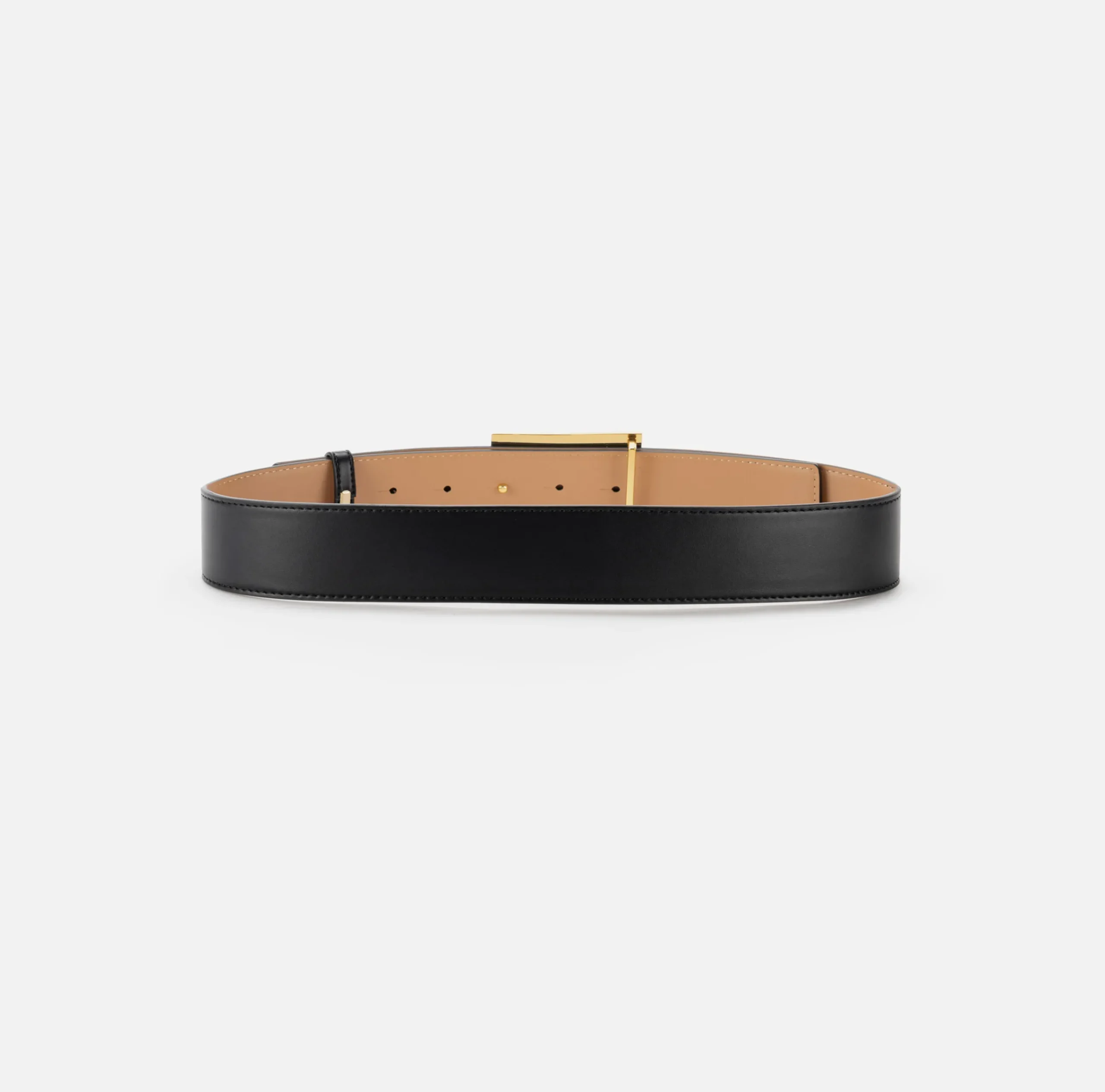 Cintura in materiale sintetico effetto pelle con chiusura a perno e placca logo in velluto e metallo dorato.