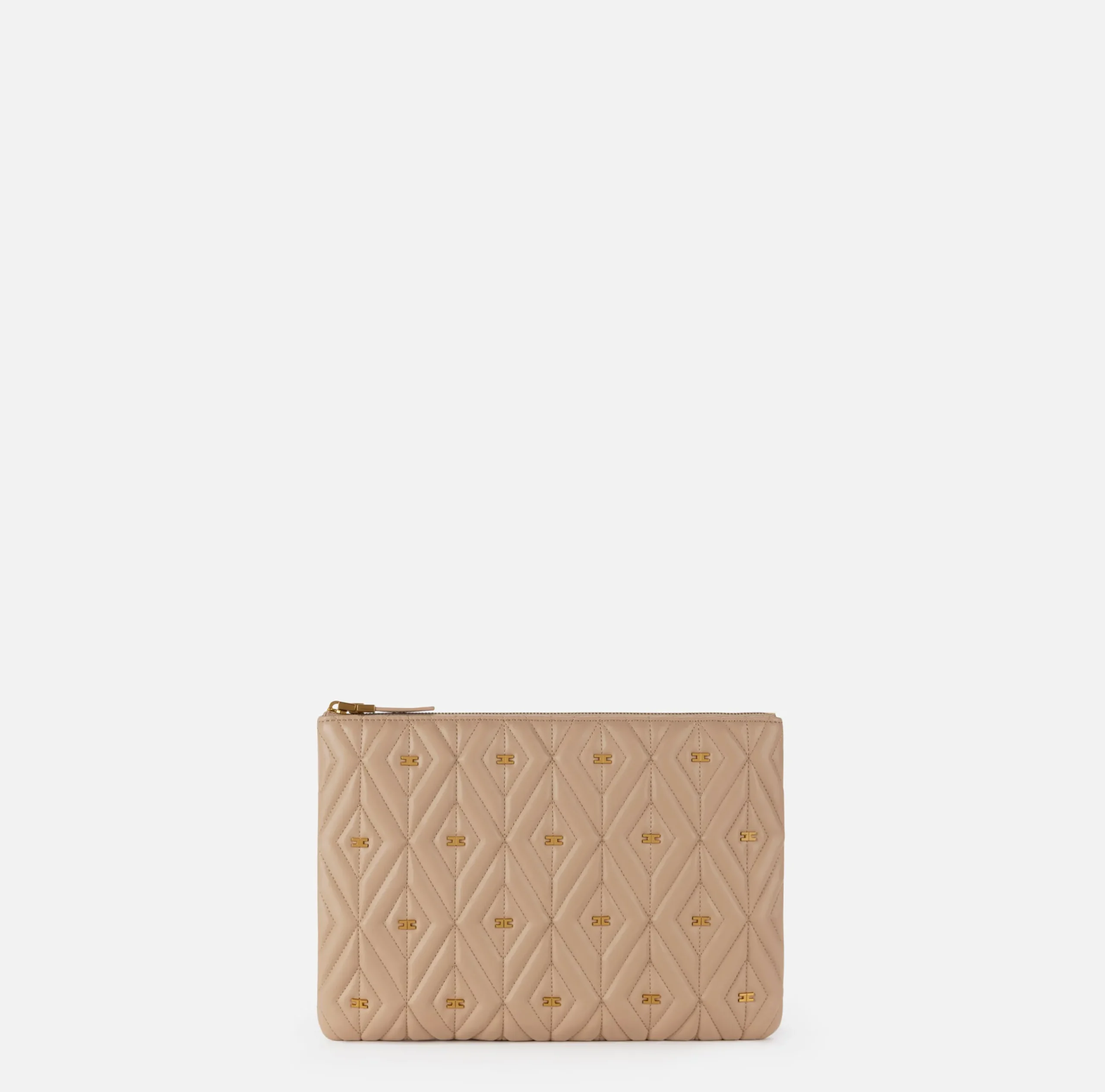 Pochette in materiale sintetico effetto pelle. Superficie trapuntata e imbottita con rivetti logati in metallo dorato vintage. È caratterizzata da tirazip logato.