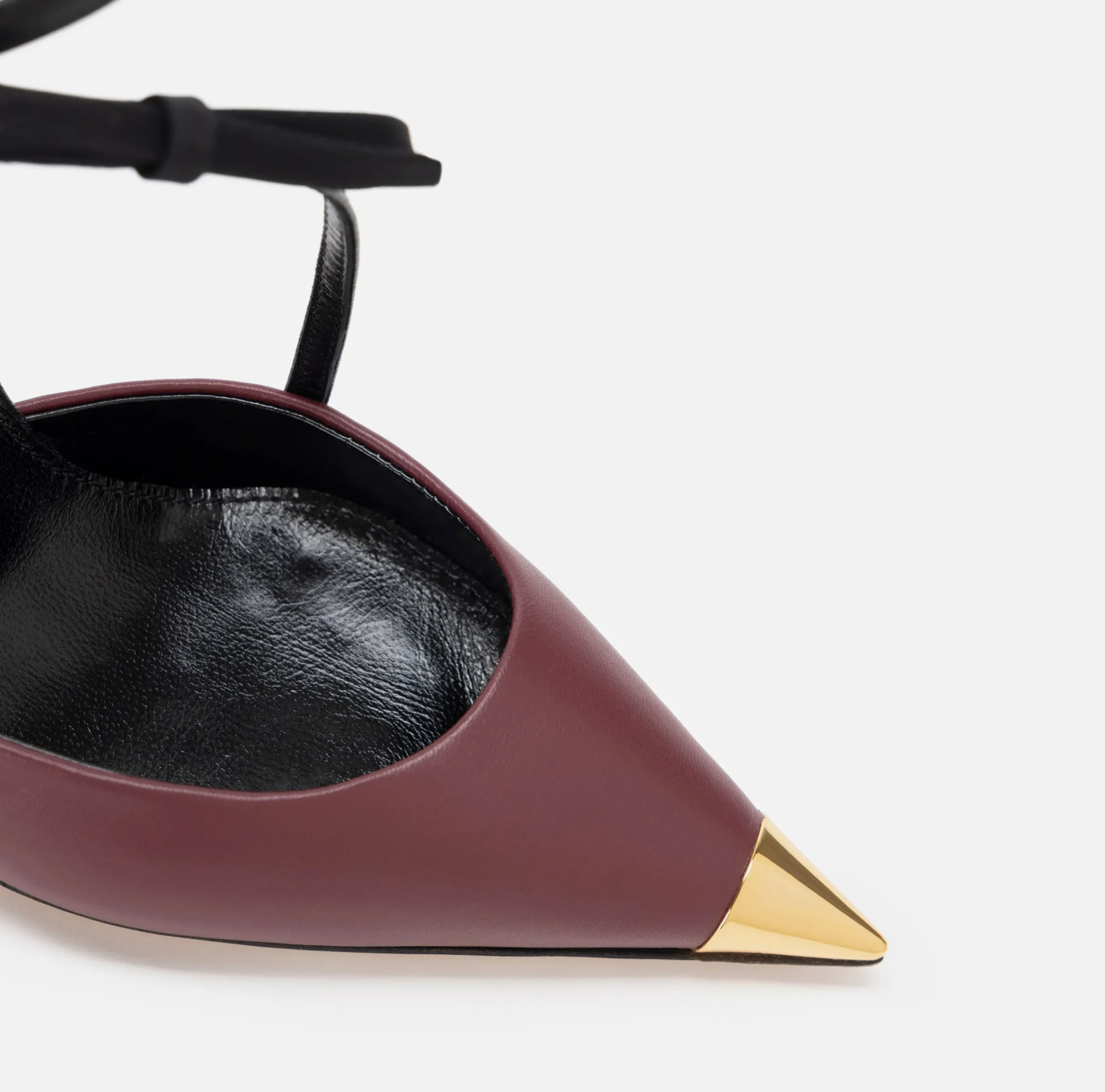 Slingback in nappa bicolore su tacco fasciato. È caratterizzato da puntalino in metallo dorato e listino con fiocco.