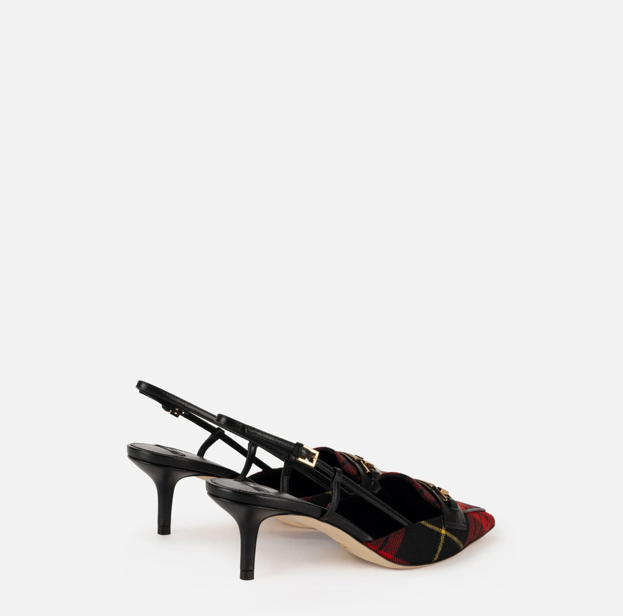 Slingback in nappa e puntalino in tartan su tacco fasciato. È caratterizzata da davantino con morsetto in metallo dorato.