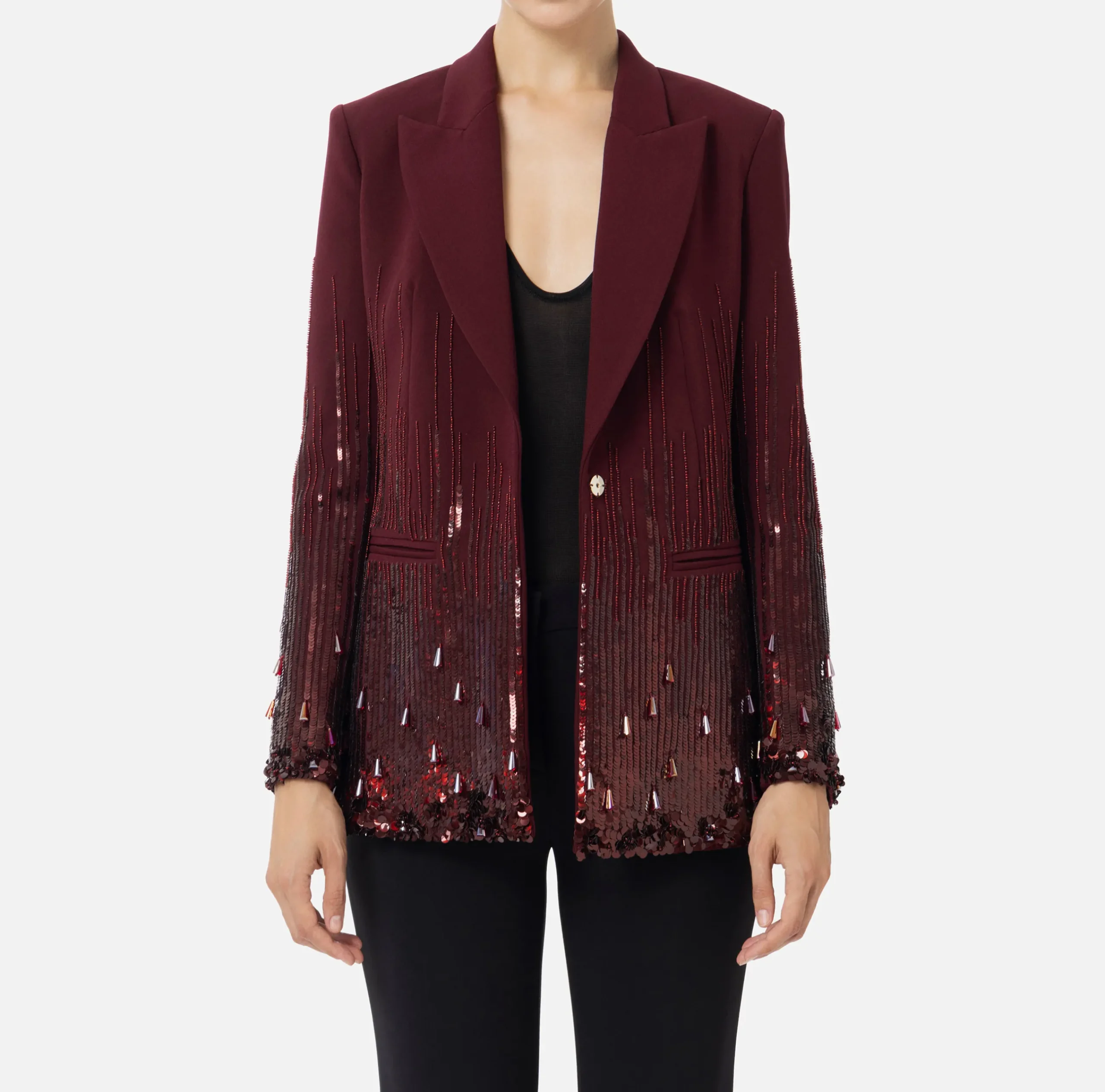 Giacca in crêpe con chiusura a monopetto e tasche frontali con pattina. È caratterizzata da ampio revers a lancia e ricamo a mano di paillettes e canottiglie a goccia al fondo.