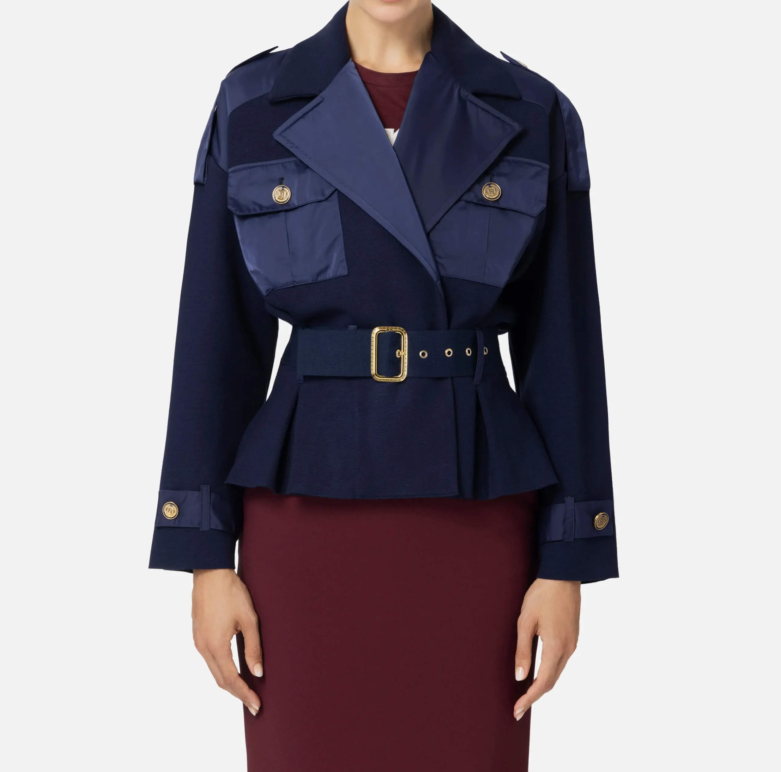 Trench corto in viscosa punto stoffa con tasche a soffietto in vela tecnica e fonde nella baschina. Il punto vita è enfatizzato da una cintura con fibbia in metallo dorato.