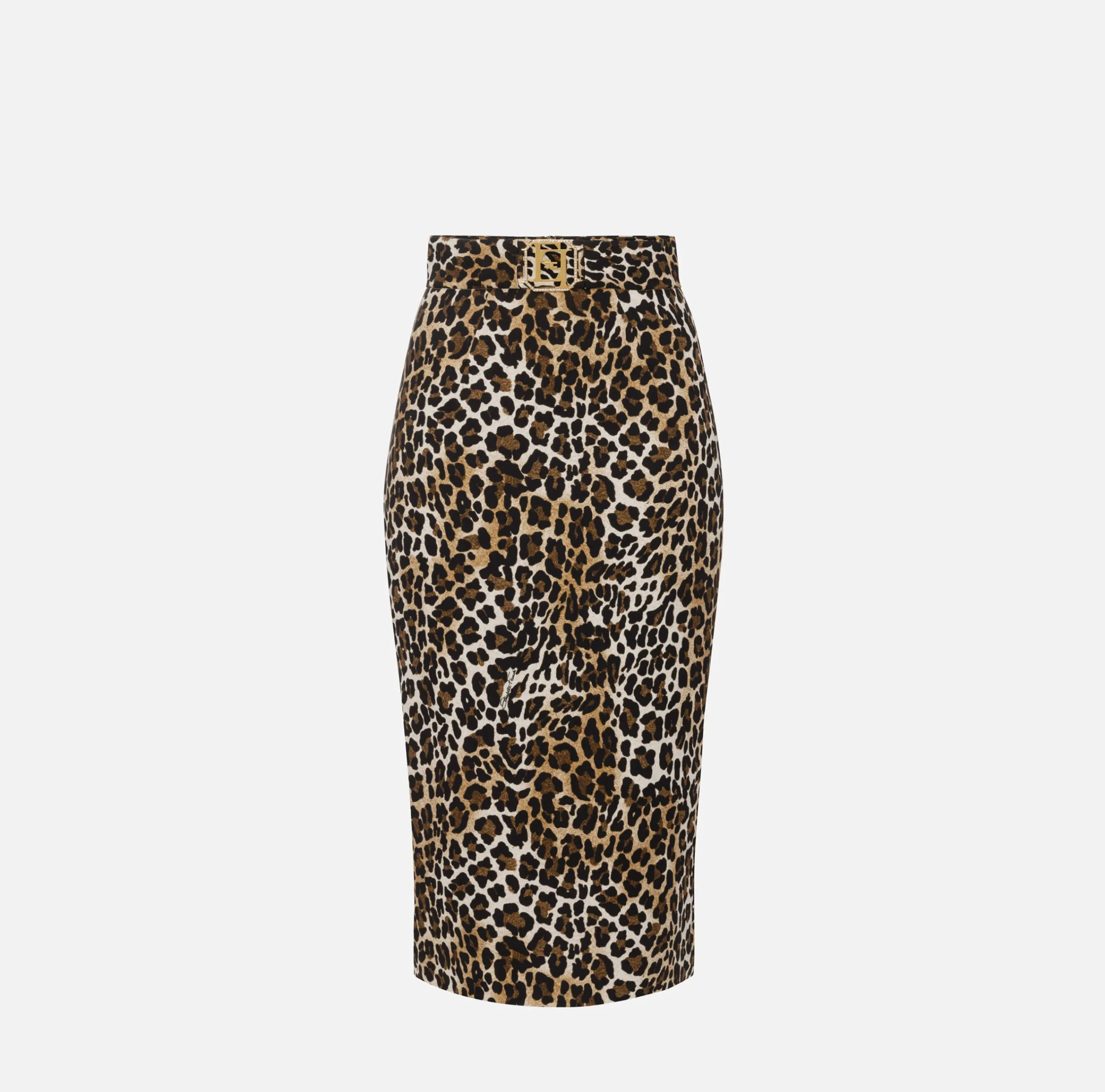 Gonna midi in crêpe stampa animalier con spacco centrale sul retro. Personalizza il capo una placca logo in metallo dorato e strass posizionata sul fascione in vita.
