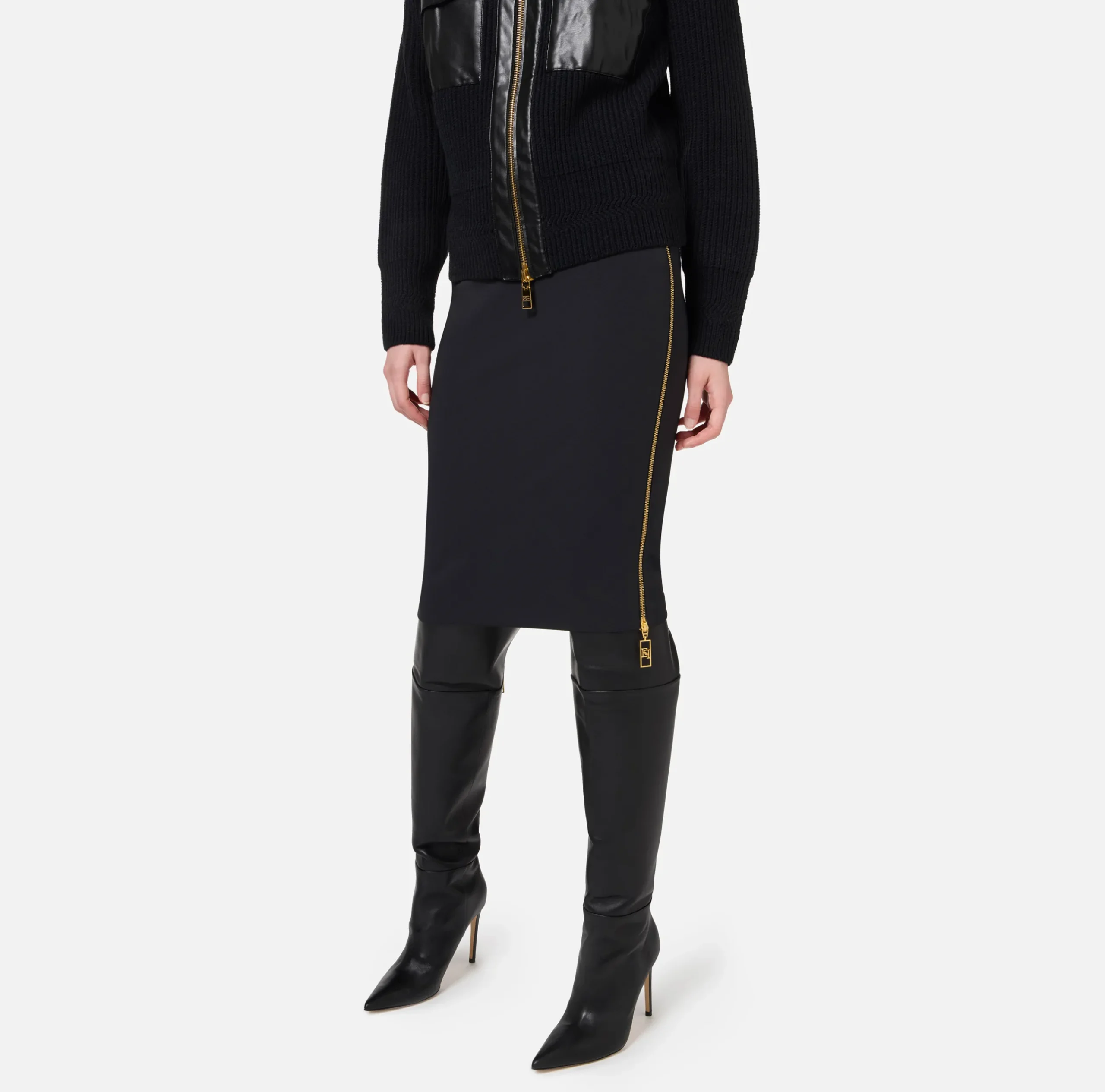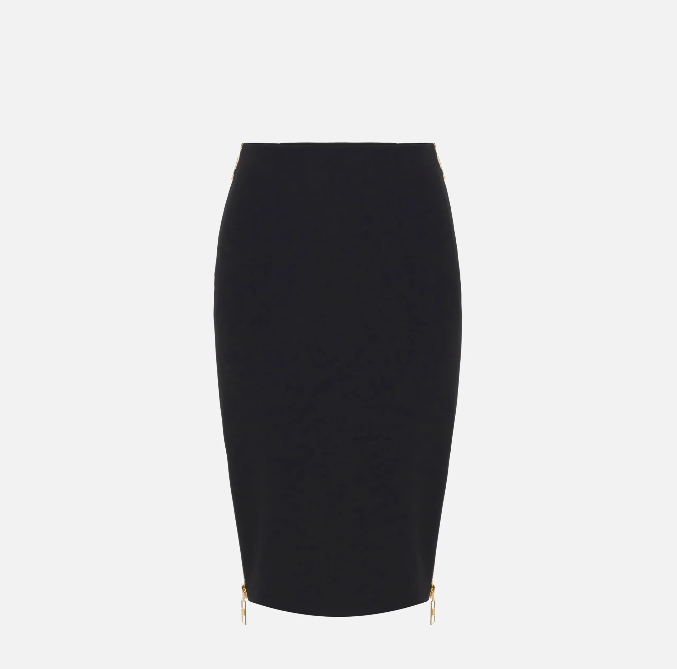 Gonna midi in doppio crêpe stretch. È caratterizzata da motivo di zip con tiretto logato che segue tutta la lunghezza dei fianchi.