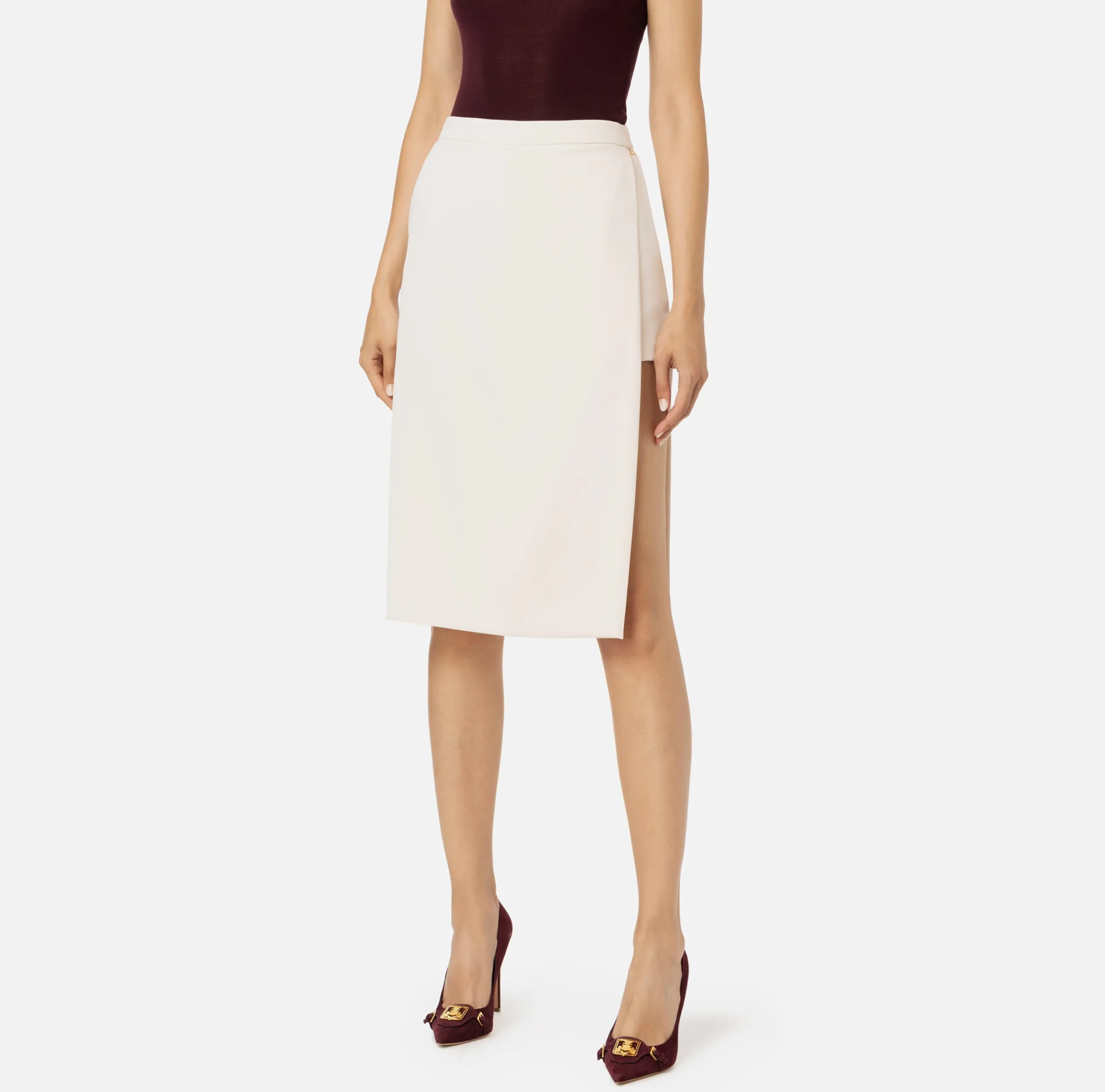 Gonna midi in crêpe stretch composta da due pannelli uniti tra loro grazie a uno shorts sottostante visibile ai fianchi. Il punto vita è enfatizzato da un fascione con placca laterale in metallo dorato.